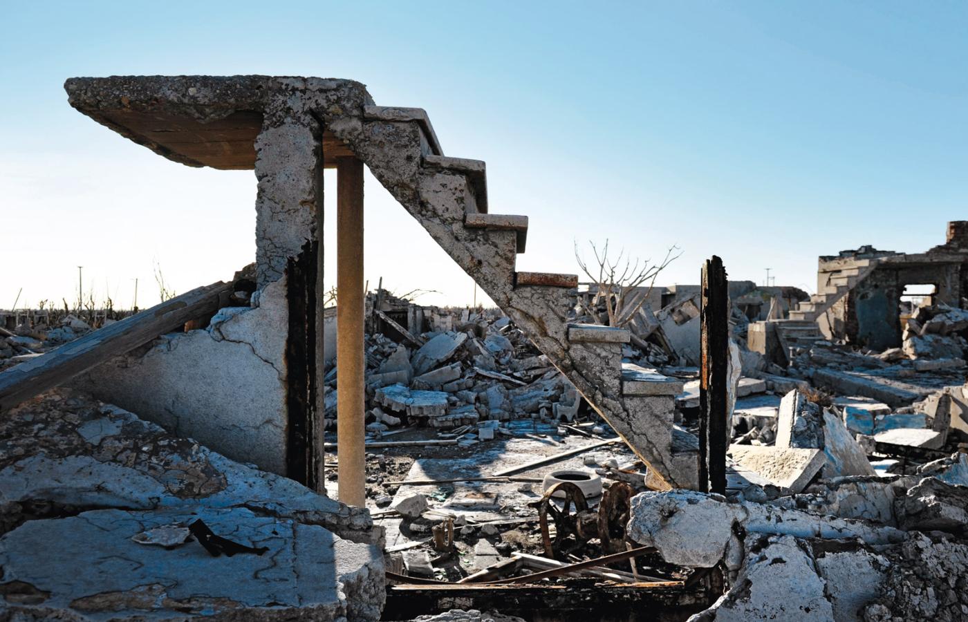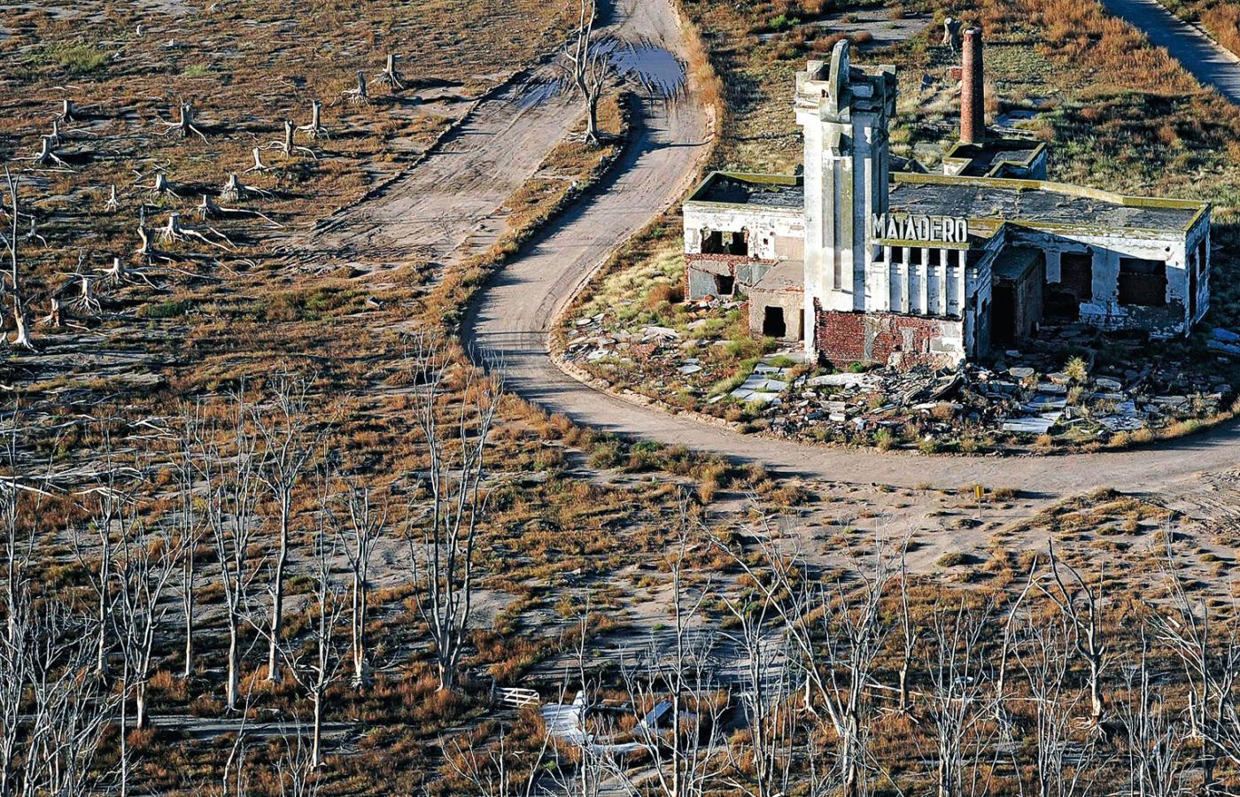 W najlepszych czasach odwiedzało je co lato 30 tys. turystów. Jeśli podróżowali samochodem lub autobusem, docierali do miasta tą samą drogą, którą dziś dojeżdża się na zwiedzanie ruin z oddalonego o 8 km Carhué, sennego miasteczka, gdzie żyje większość byłych mieszkańców Epecuén. Droga, przejezdna dopiero od niedawna, prowadzi między kikutami drzew. Ten siwoszary krajobraz w środku wiosennie zazielenionej pampy jest jak kraina z mrocznej baśni. Po lewej, niczym zamczysko czarnoksiężnika albo świątynia krwawego kultu, wznosi się zjawiskowa rzeźnia w stylu art déco, zaprojektowana przez kultowego architekta Francisco Salamone, o którego kunszcie świadczy to, że budynek – jako jeden z niewielu w Epecuén – wciąż trzyma się w pionie. Po drugiej stronie drogi, jak strażnicy zaklęci w ptaki, zbite w intensywnie różową plamę stado flamingów kontempluje taflę słonego jeziora.