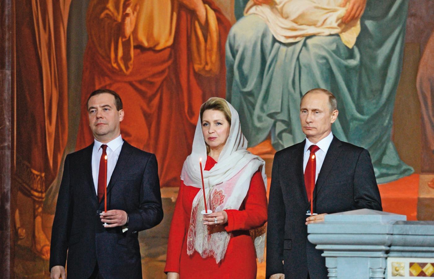 Kreowaniu Putina na wiernego syna prawosławia towarzyszy polityka wzmacniania Kościoła prawosławnego jako instrumentu ideologii państwotwórczej. Chrześcijaństwo (wraz z islamem, buddyzmem i judaizmem) to cztery religie mające w Rosji status legalny. Prawosławie ma pozycję uprzywilejowaną, choć formalnie nie jest religią państwową. Widok głowy świeckiego w końcu państwa (obojętne, Jelcyna, Putina czy Miedwiediewa) w cerkwi czy na uroczystościach religijnych wpisuje się w długą tradycję historyczną sojuszu cerkiewnego ołtarza z carskim tronem.