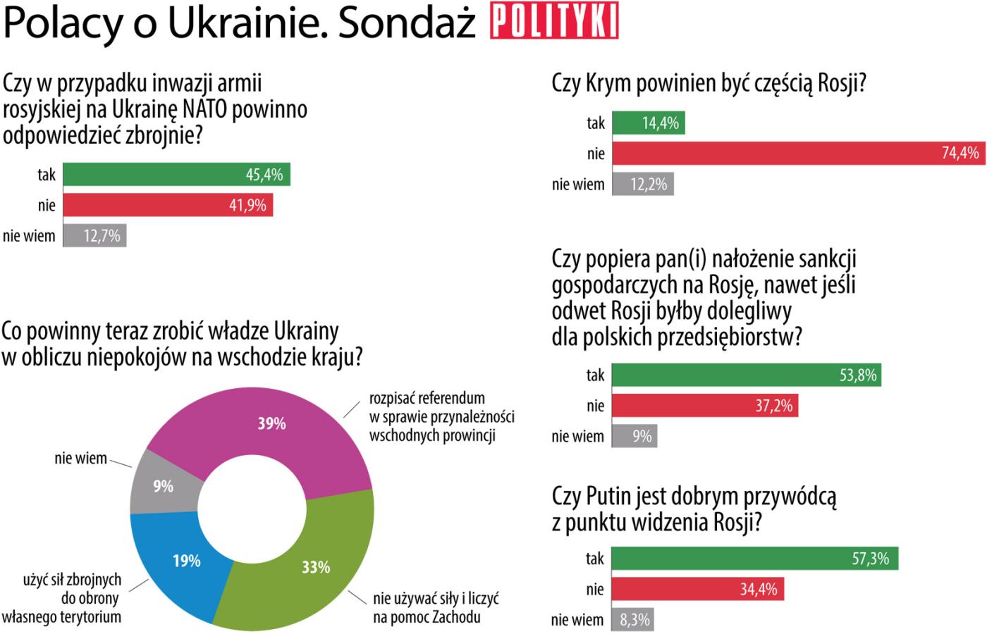 Od pospiesznego referendum na Krymie minął już prawie miesiąc, Władimir Putin szykuje się do triumfalnej wizyty na nowo pozyskanych ziemiach. Ale opinia ankietowanych Polaków jest stanowcza i prawie jednogłośna: 74,4 proc. uznaje, że Krym nie powinien być częścią Rosji (odmiennego zdania jest 14,4 proc.). Niezależnie od historycznych zaszłości, liczebnej przewagi rosyjskojęzycznej ludności i stanu jej nastrojów ocena faktu, że jeden kraj znienacka zagarnia kawałek drugiego kraju, stosując metodę faktów dokonanych – wydaje się jednoznaczna.
