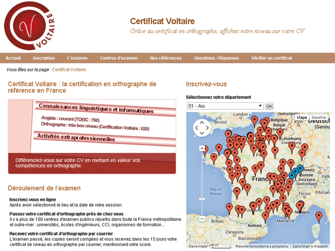 Może język polski sprawia cudzoziemcom trudności, ale francuska ortografia sprawia problemy nawet rodowitym Francuzom. Kto ma wątpliwości, jak coś napisać poprawnie, może się podszkolić online w programie pod nazwą Certyfikat Woltera, wymyślonym przez miłośników języka i kultury. Program nie tylko poprawia błędy, ale też proponuje internautom kolejne etapy doskonalenia umiejętności. Korzysta z niego 1,5 mln użytkowników – z administracji, szkół wyższych i przedsiębiorstw. Ale rzecz nie kończy się na zabawach internetowych. Kiepska znajomość ortografii nikomu specjalnie nie przeszkadzała, aż biznes się zorientował, że byki w korespondencji i materiałach reklamowych obniżają zaufanie potencjalnych klientów do solidności firmy albo marki. Toteż coraz więcej przedsiębiorstw przy rekrutacji albo promocji pracowników wymaga certyfikatu Woltera. W stu ośrodkach w całej Francji można się zgłosić na egzamin, by taki certyfikat otrzymać. Egzamin trzeba zdać osobiście, a nie online.