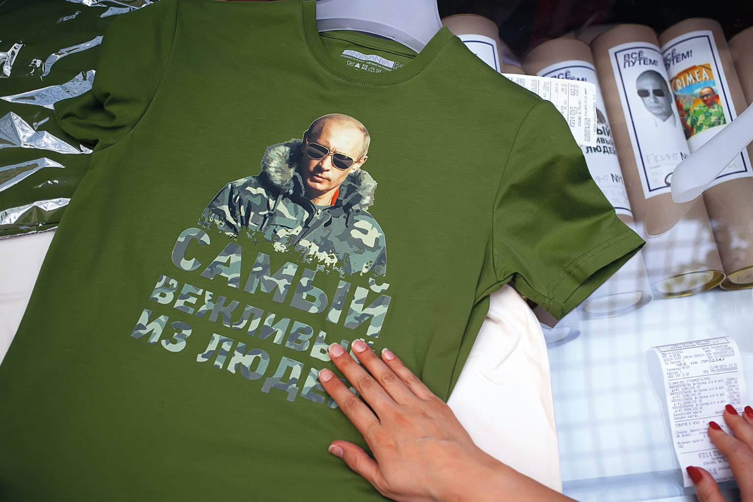 W słynnym domu towarowym GUM w Moskwie pojawiła się w sprzedaży kolekcja koszulek z wizerunkami Władimira Putina. Sklep młodych projektantów AnyaAnya był otwarty tylko trzy dni, ale partia 3 tys. koszulek zniknęła w ciągu kilku godzin. Kolekcja nosiła nazwę „Wsjo putiom” (Wszystko gra) i składała się z 15 różnych wzorów i osłonek na iPhone’a. W jednej z wersji Putin był w stylu moro, z napisem u dołu „Najbardziej uprzejmy człowiek” (prezydent podczas referendum na Krymie mówił o umundurowanych „zwykłych uprzejmych ludziach”, którzy nadzorowali głosowanie). W innej Putin w garniturze i krawacie, z dopiskiem: „Czytam w twoich myślach”. Szczególną popularnością cieszyła się koszulka w stylu hawajskim i podpis po angielsku: „Pozdrowienia z Krymu!”, a także wersja „Nas nie dogoniat”. Cena – 1200 rubli (105 zł), osłonka na telefon – dwa razy mniej, ale nie była aż tak popularna.