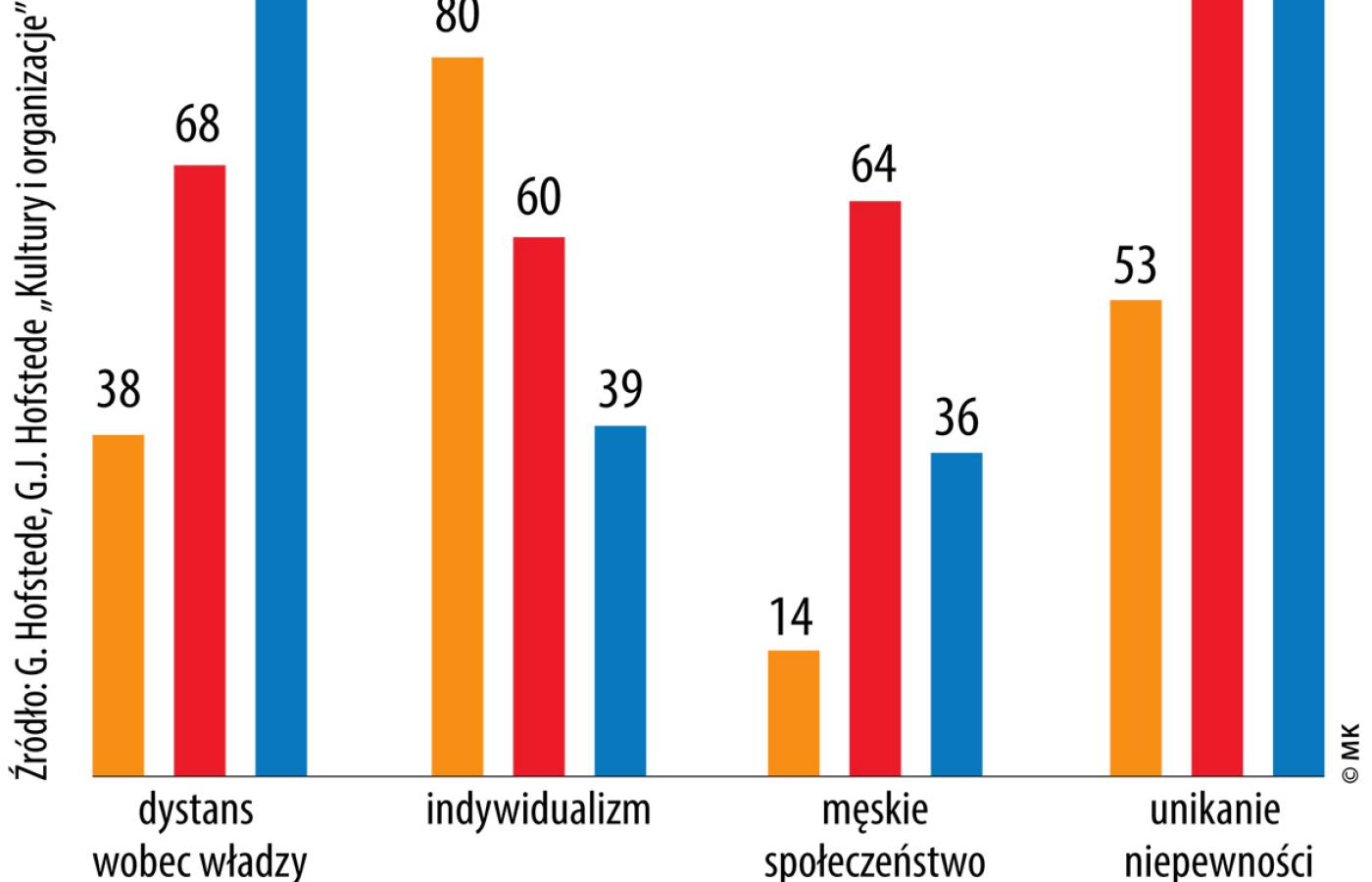 Gert Jan Hofstede, porównując trzy kraje, Holandię, Polskę i Rosję, bierze pod uwagę tzw. wymiary kultur narodowych. W tym m.in. dystans wobec władzy, a więc jak bardzo podwładni lub obywatele oddaleni są od szefów czy przywódców, jak traktują hierarchię. Drugim wymiarem jest poziom indywidualizmu – czy ważne jest osiąganie celów pojedynczych osób, czy przedkładany jest mu interes całej grupy. Zwraca też uwagę na męskość społeczeństwa. Te o jego niższym poziomie stawiają obu płciom takie same wymagania, np. wszyscy muszą się troszczyć o innych. Ważna jest też jakość stosunków między ludźmi, konflikty rozwiązywane są tu w drodze negocjacji. Społeczności bardziej męskie jasno określają społeczne role płci i w przypadku rozziewu interesów dążą do konfrontacji. I jeszcze unikanie niepewności, czyli na ile akceptujemy zachodzące zmiany, np. społeczeństwa oczekujące przewidywalności (unikające niepewności) zabezpieczają się, tworząc liczne prawa i regulacje.
