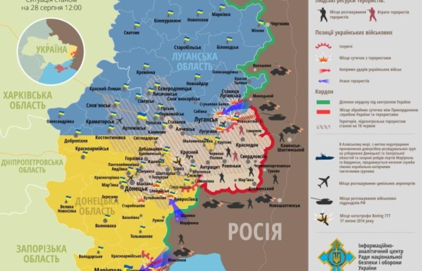 W środę Petro Poroszenko podpisał tajny dekret wprowadzający w życie decyzje Rady Bezpieczeństwa z 27 sierpnia, który określa zadania dowództwa w nowych okolicznościach. W sąsiadującym z zajętymi ostatnio miejscowościami Dniepropietrowsku odbędzie się nadzwyczajne posiedzenie Rady Obrony regionu z udziałem kierownictwa obwodu i przedstawicieli struktur siłowych.