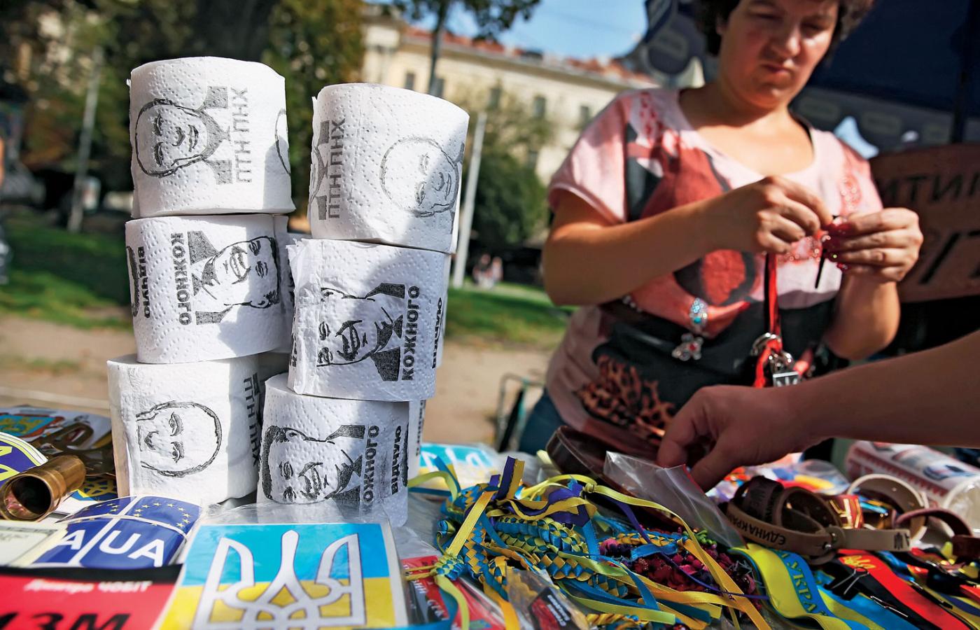 Handluje się za to patriotycznymi i antyrosyjskimi gadżetami – flagami narodowymi i, na przykład, papierem toaletowym z nadrukowanym Władimirem Putinem.
