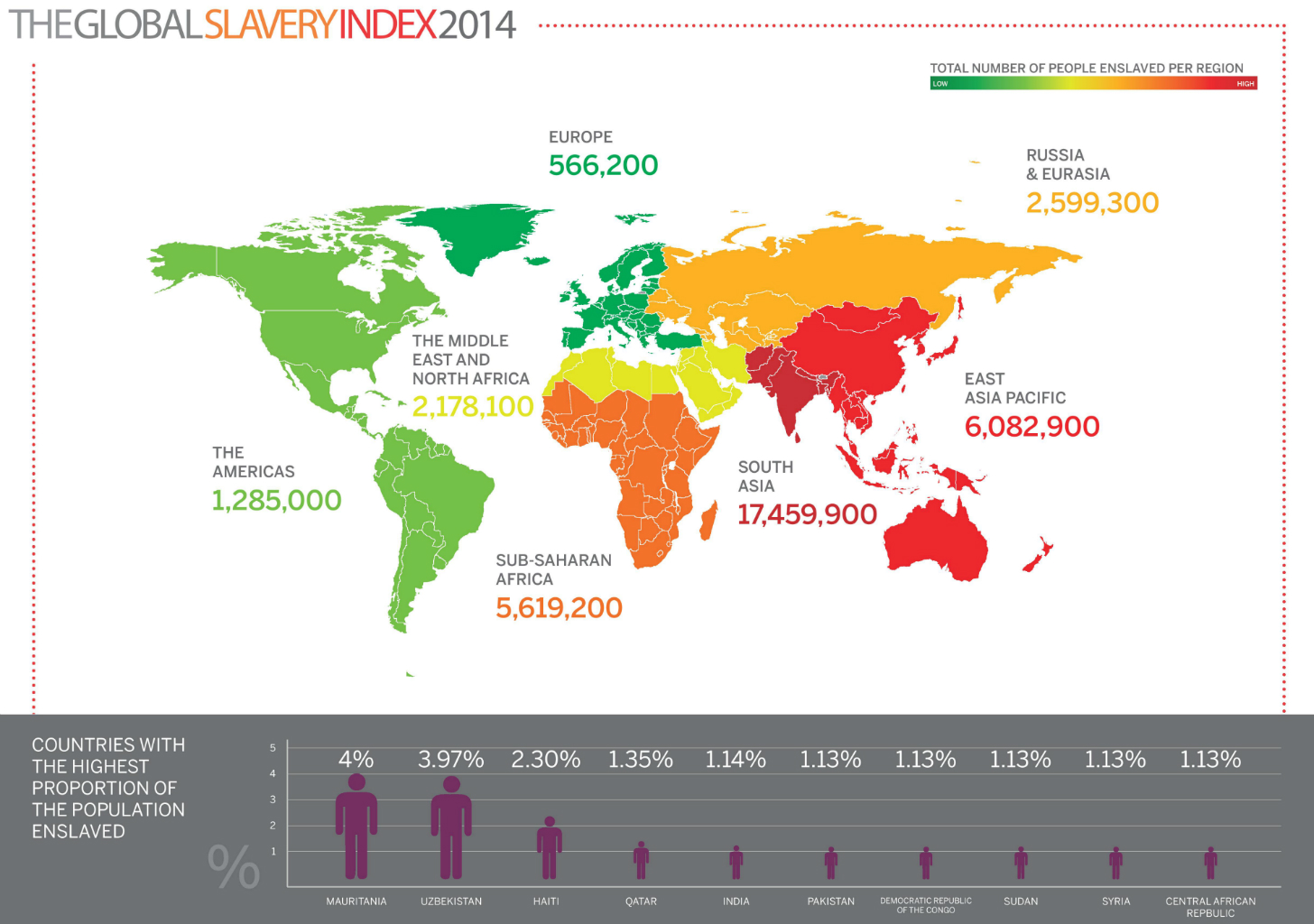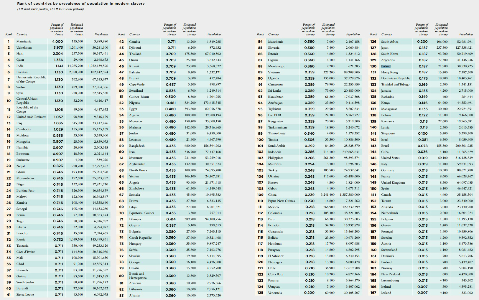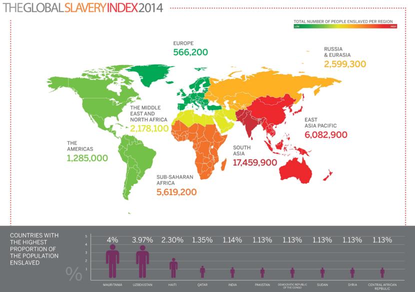 Jeśli brać pod uwagę proporcję liczby zniewolonych do liczby mieszkańców, największy kłopot z niewolnictwem mają: Mauretania (4 proc. społeczeństwa), Uzbekistan (3,97 proc.), Haiti (2,3 proc.), Katar (1,36 proc.) oraz Indie (1,14 proc.). Cały ranking do obejrzenia tutaj.