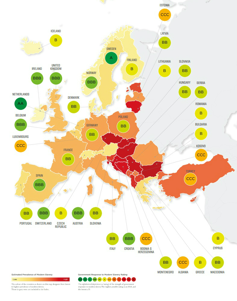 W Europie skala zniewolenia jest najniższa. Ale nie znaczy to, że możemy mieć dobre samopoczucie i czyste sumienie. Autorzy raportu punktują: obywatele Unii Europejskiej walczą z nadużyciami na tle seksualnym, prostytucją i dużym odsetkiem zadłużonych (to ostatnie dotyczy głównie sektorów rolnictwa, budownictwa i przetwórstwa żywności). Autorzy wskazują też na prosperujący w Europie handel ludźmi.