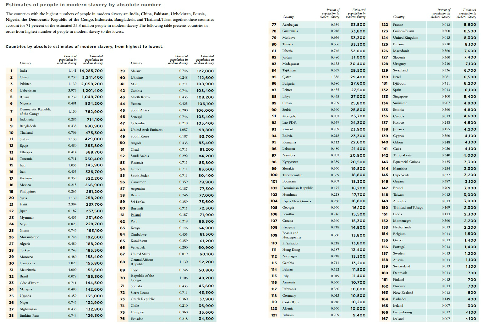 W Indiach, które znalazły się na szczycie zestawienia (zobacz), jest aż 14 mln 290 tysięcy zniewolonych ludzi (na 1,252 mld mieszkańców). W Chinach – 3 mln 240 tysięcy (1,350 mld), w Pakistanie – 2 mln 60 tysięcy (181,1 mln), w Uzbekistanie – 1 mln 200 tysięcy (29,56 mln), w Rosji – 1 mln 50 tysięcy (ok. 145 mln).