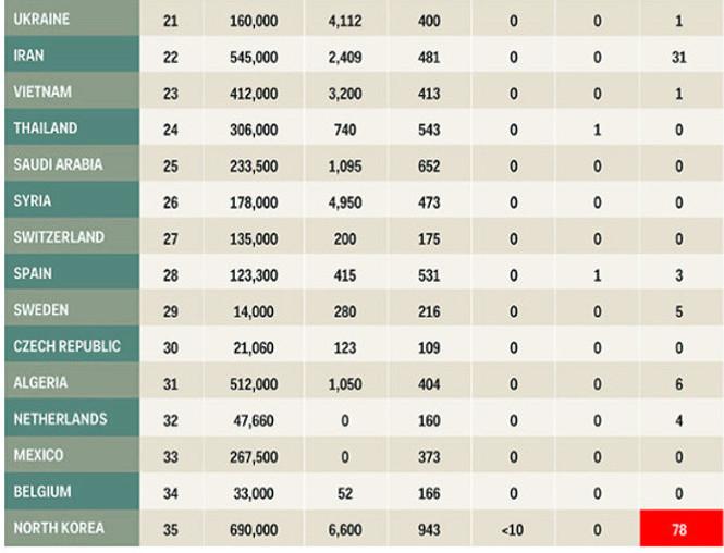 Ponieważ sama liczebność armii w XXI wieku nie przekłada się wprost na jej możliwości, w ostatnim zestawieniu najpotężniejszych armii świata serwisu Global Firepower tylko Korea Południowa zmieściła się w dziesiątce. A Korea Północna znalazła się daleko chociażby za Polską: