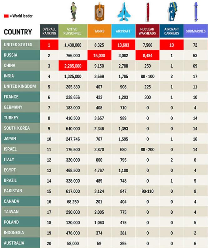 Dane do infografiki pochodzą z „Encyclopedii Britanniki”, zasobów brytyjskiego think tanku IISS oraz Wikipedii. W swoich szacunkach autor uwzględnił nie tylko żołnierzy z czynnej służby wojskowej – wówczas największą armię „Wschodu” miałyby obecnie Chiny, a „Zachodowi” przewodziłyby Stany Zjednoczone – ale również organizacje paramilitarne. W przypadku Korei Północnej jest to przede wszystkim Czerwona Gwardia Robotniczo-Chłopska, która liczy 3,5 miliona członków.