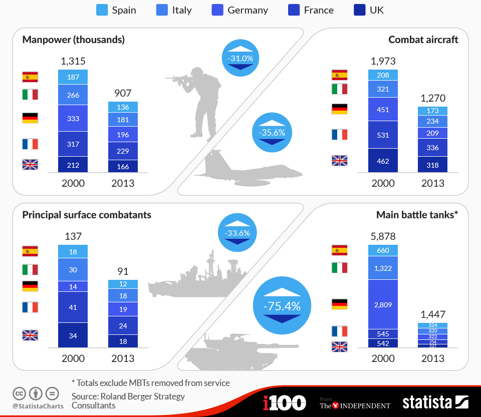 Oszczędności pięciu europejskich krajów NATO – Wielkiej Brytanii, Niemiec, Francji, Hiszpanii oraz Włoch – ilustruje poniższa infografika. Wynika z niej, że w ciągu ostatnich kilkunastu lat wielkość armii tych państw oraz liczba samolotów i okrętów (nawodnych) będących na wyposażeniu tychże armii zmalała o jedną trzecią. A w przypadku czołgów redukcja ta sięgnęła aż 75 proc.: