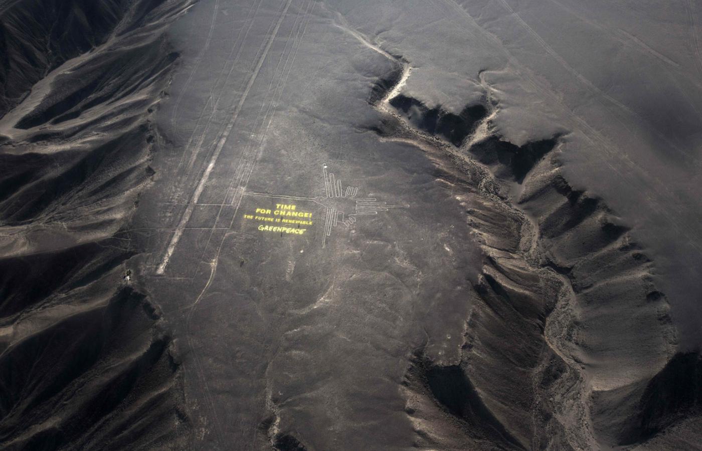 Jednak Szczyt w Limie przejdzie do historii z innego powodu. Otóż działacze Greenpeace’u, w liczbie kilkudziesięciu, udali się do oddalonego od Limy o ponad 300 km płaskowyżu Nazca i tam, przekraczając strefę zakazu wejścia, umieścili obok słynnego geoglifu przedstawiającego ptaka napis: „Czas na zmianę. Przyszłość jest odnawialna. Greenpeace”. Napis, wykonany z tworzywa sztucznego, został umieszczony obok wizerunku ptaka. Kilkadziesiąt osób, które zajmowały się tym przedsięwzięciem, poważnie uszkodziło otoczenie niezwykle cennego i chronionego zabytku.