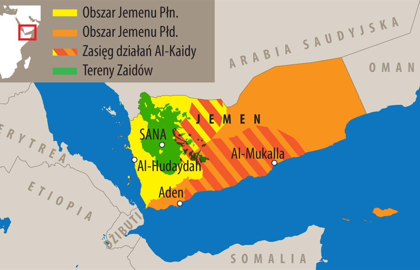 To właśnie zaidyccy duchowni w IX w. stworzyli ośrodek władzy, który przetrwał z niedługimi przerwami do 1962 r., kiedy to ostatniego zaidyckiego imama obaliła grupa lewicowych oficerów, inspirowanych republikańską rewolucją Gamala Abdela Nasera w Egipcie. Spadkobiercy tych wojskowych rządzili w Sanie do poprzedniej środy. Drugi ośrodek władzy na terenie dzisiejszego Jemenu powstał w południowych prowincjach pod rządami Brytyjczyków, którzy w połowie XIX w. w Adenie założyli bazę zaopatrzeniową dla swoich statków w drodze do Indii.