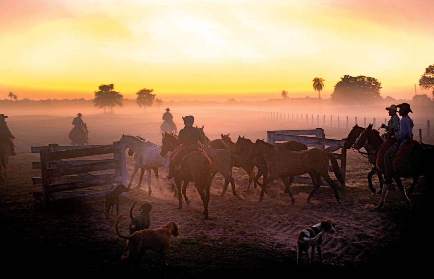Nadzorca kowboi Jair Rosa stoi w chmurze pyłu na pagórku. Za plecami ma ciemnoniebieski staw. Na drugim brzegu bajorka brązowo-żółty kajman bezszelestnie wsuwa się do wody, rozdrażniony zamieszaniem.