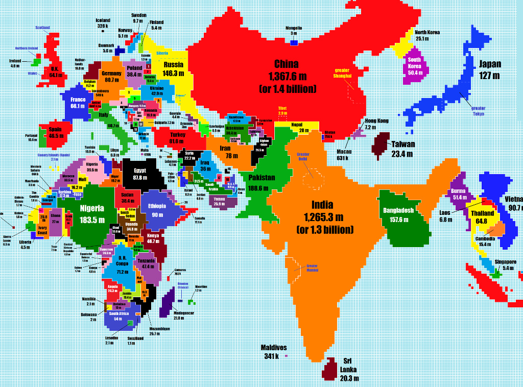 O zasadności tych prognoz wydaje się świadczyć powyższa mapa, na której rozmiary krajów dopasowano do ich ludności – każdy zamalowany kwadrat reprezentuje 500 tys. obywateli. Na tak zaprojektowanej mapie Chiny okupują całą północno-wschodnią Azję. Głównie kosztem Rosji zepchniętej na obrzeża Europy.