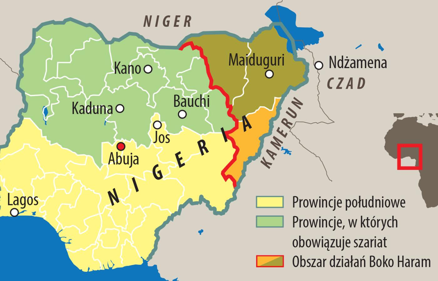 Nigerię, terytorium trzech Polsk, zamieszkuje 180 mln osób, tyle co Francję, Wielką Brytanię i Hiszpanię razem wzięte. Nigeria ma też dziesiątki rywalizujących ze sobą lub wręcz jawnie skonfliktowanych grup etnicznych mówiących własnymi językami i proporcjonalnie dużo problemów. Na spoistości państwa, sztucznie wykrojonego w epoce kolonializmu, cieniem kładzie się fundamentalny spór, który przeważnie chrześcijańskie południe od lat toczy o prawie wszystko z przeważnie muzułmańską północą.