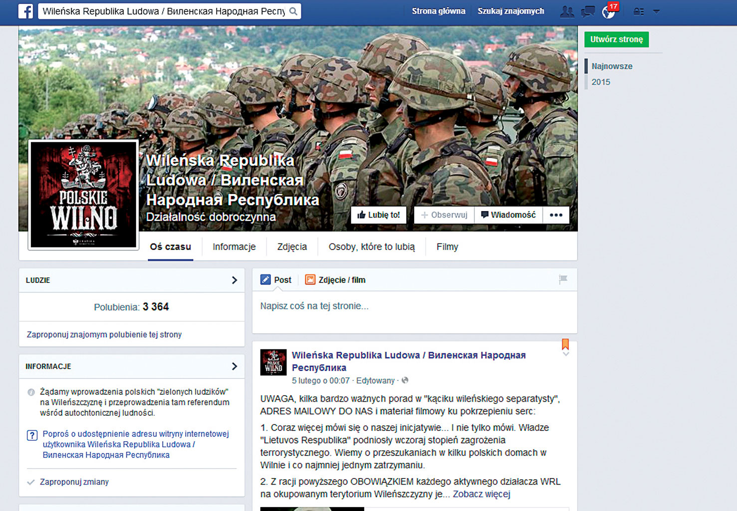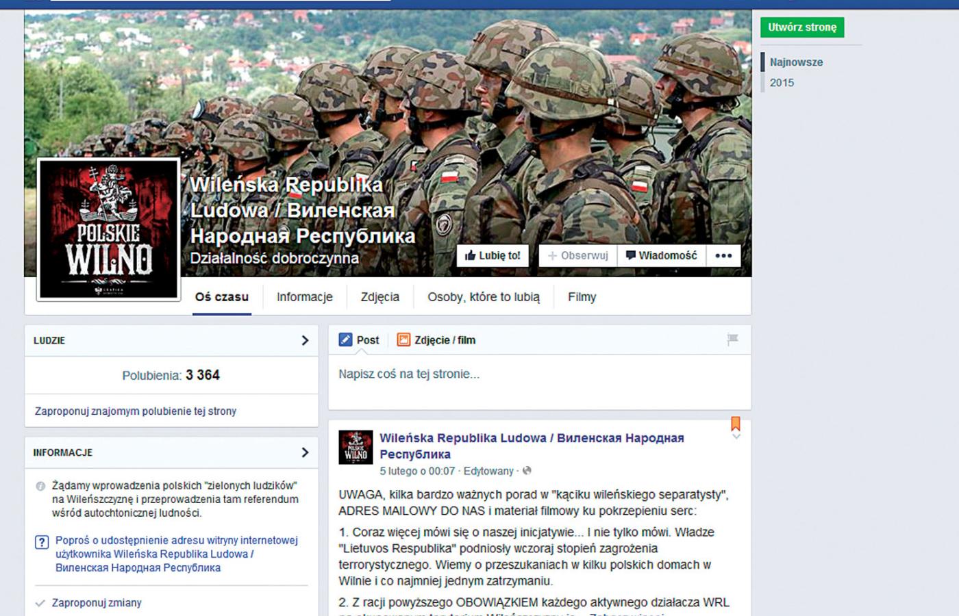 Na Facebooku pojawiły się profile „Wileńskiej” i „Lwowskiej Republiki Ludowej”. W opisie można przeczytać, że autorzy strony żądają „wprowadzenia polskich zielonych ludzików” na Wileńszczyznę i Lwowszczyznę i „przeprowadzenia tam referendum wśród autochtonicznej ludności”. Szczególnie profil „WRL” rozpętał sporą awanturę, a jego uruchomienie zbiegło się z pojawieniem wymalowanego sprayem na murze napisu „Wilno = Donbas” w Nowej Wilejce, lewobrzeżnej dzielnicy Wilna, w której grubo ponad jedną trzecią mieszkańców stanowią Polacy.