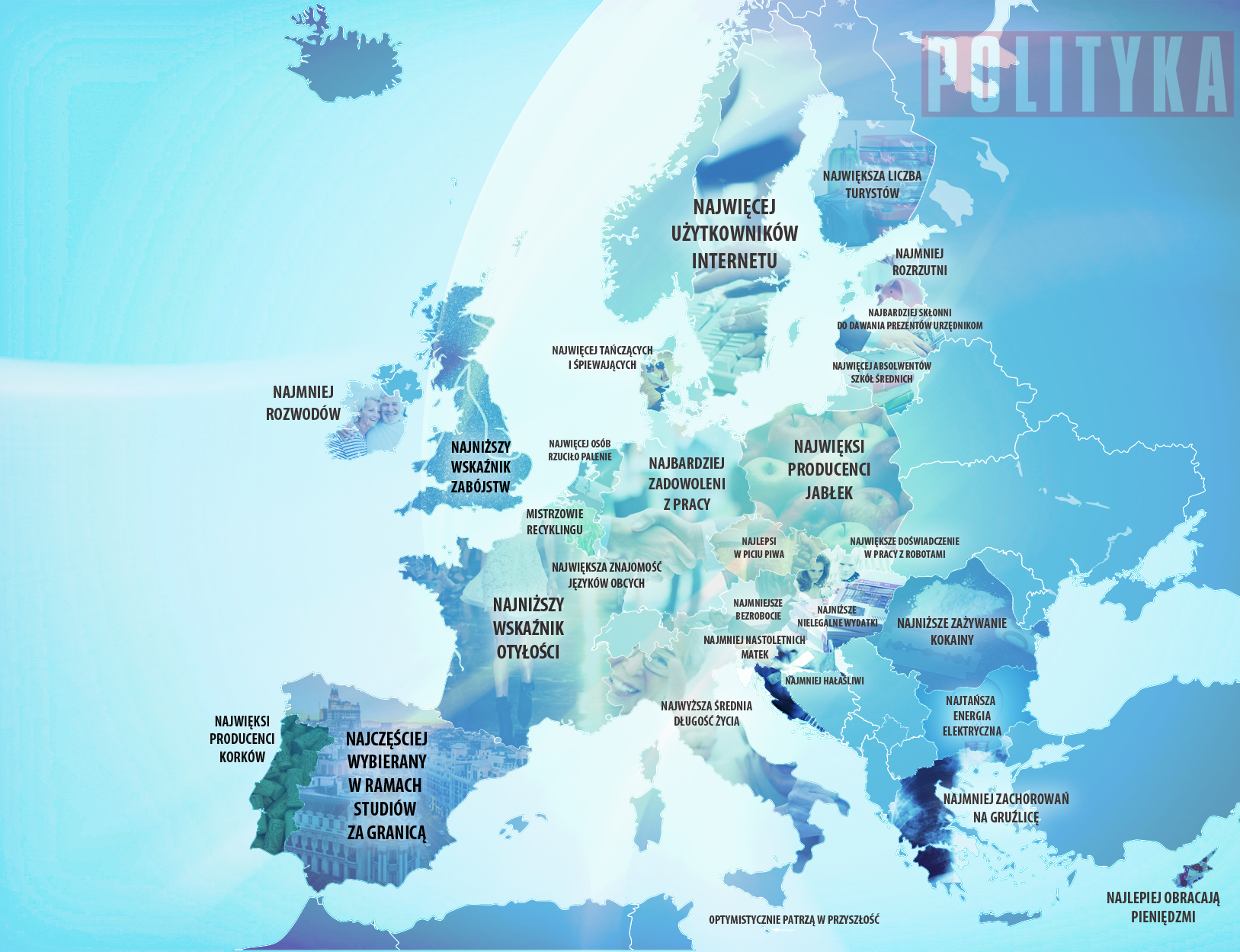 Dane, którymi posłużył się serwis Thrillist.com z siedzibą w Nowym Jorku, są powszechnie dostępne. Ale prawdopodobnie żaden Europejczyk nie wziąłby ich pod uwagę, gdyby przyszło mu opisywać poszczególne państwa Wspólnoty, szukać ich dobrych stron i słabości. Bo czy żyjąc w Polsce i obcując z Polakami, przyszłoby nam do głowy, że...