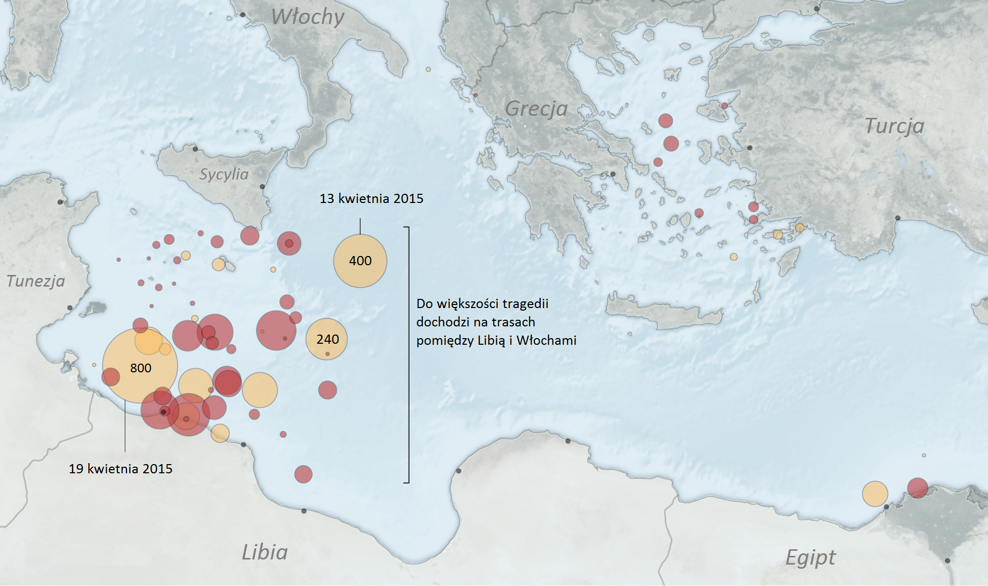 Jak pokazuje mapa przygotowana przez amerykański dziennik „The New York Times” na podstawie danych Międzynarodowej Organizacji ds. Migracji, do większości tragedii dochodzi w regionie pomiędzy Libią a Włochami. Każdy z okręgów reprezentuje liczbę ofiar śmiertelnych i osób zaginionych. (Kolorem czerwonym oznaczono tragedie, co do których znamy dokładną liczbę ofiar. Na żółto te, których dokładne skutki są jeszcze ustalane).