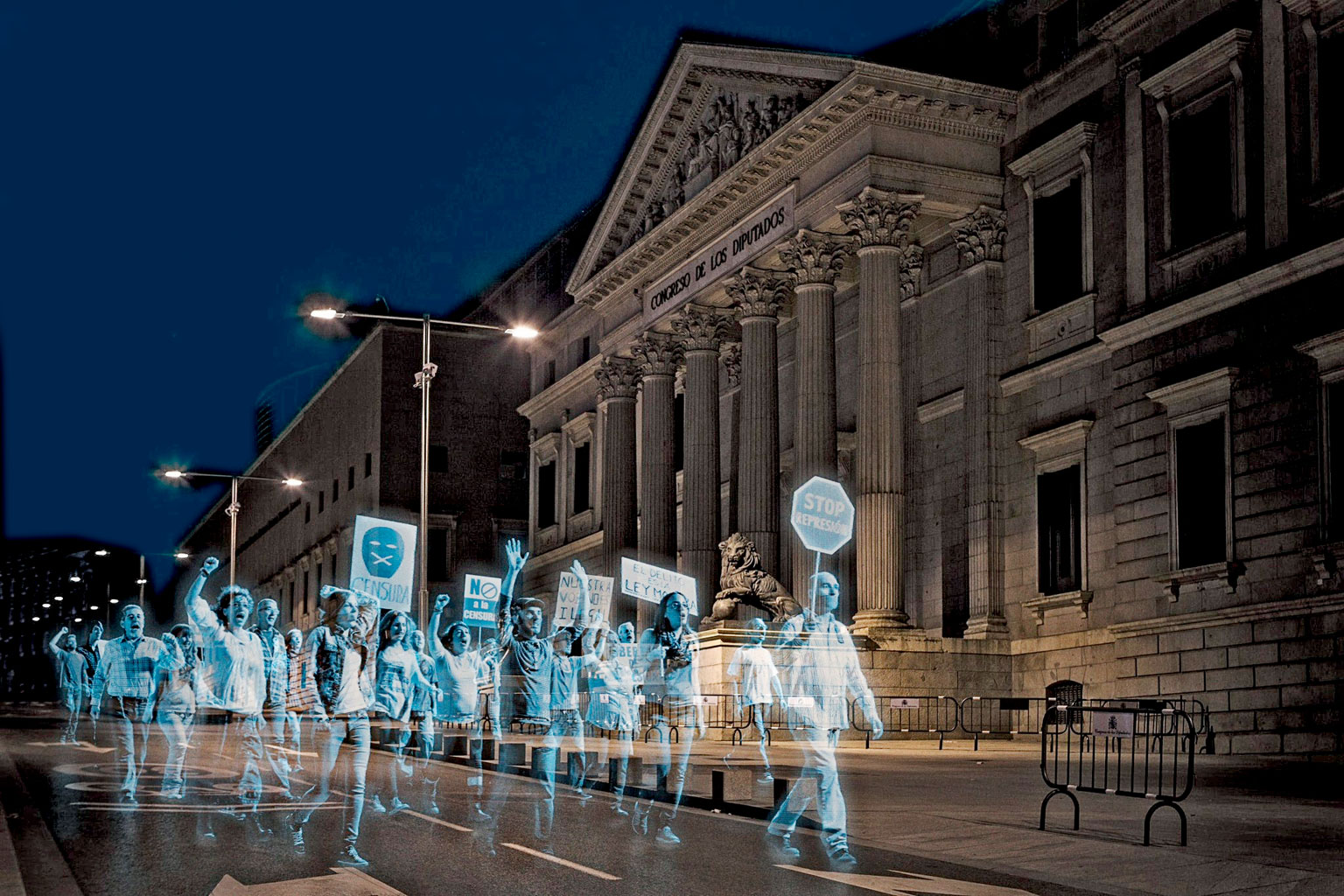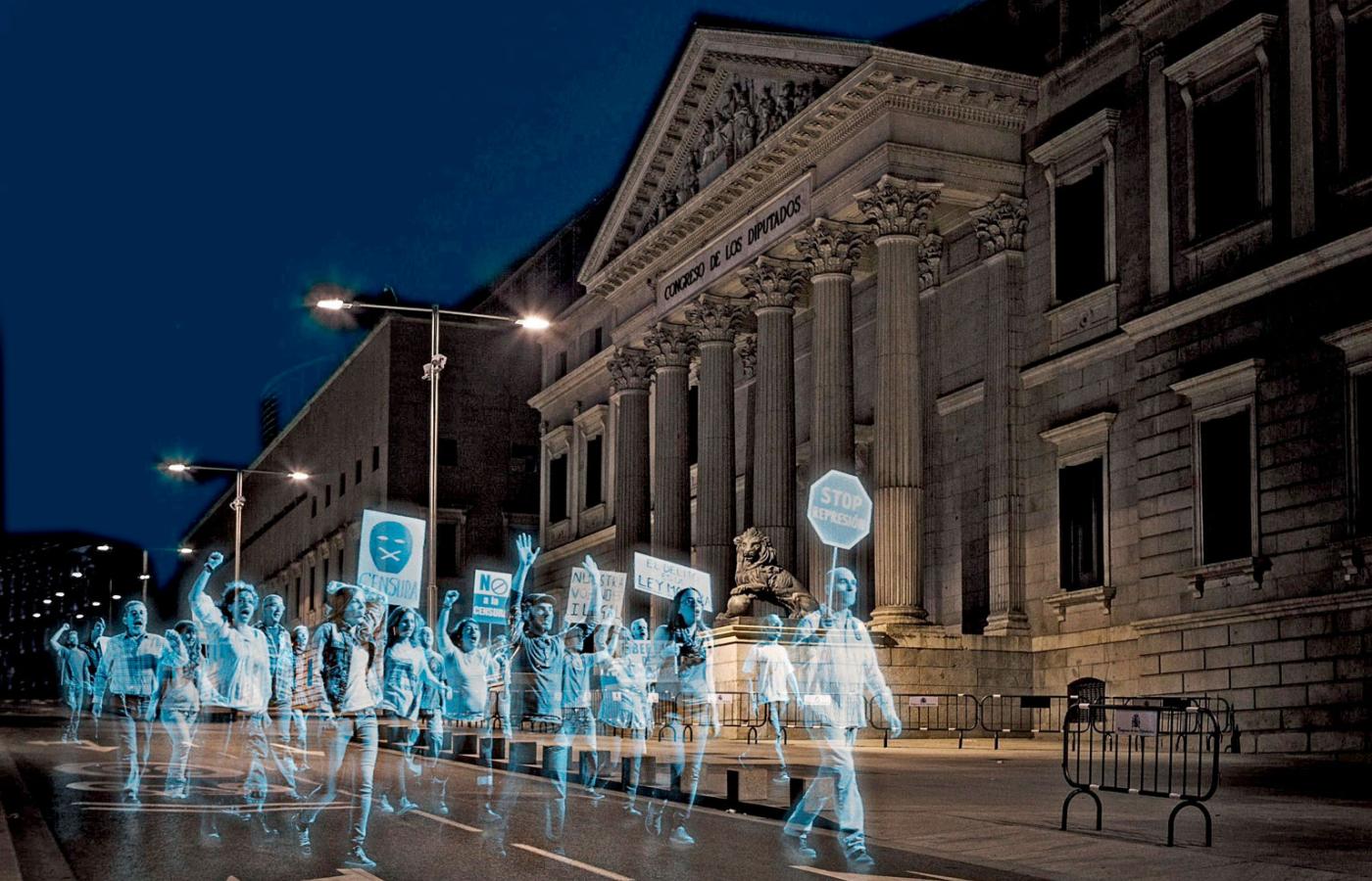 Hiszpańska organizacja pozarządowa nazwała się Nie Jesteśmy Przestępstwem, a powinna: Jesteśmy Pomysłowi. Jej działacze zorganizowali pod parlamentem w Madrycie demonstrację, której jedynymi uczestnikami było... kilkanaście tysięcy hologramów. To niecodzienny protest przeciwko planowanej ustawie o bezpieczeństwie publicznym, która bardziej znana jest jako ley mordaza, prawo knebla. Projekt uznaje manifestacje w określonych miejscach za naruszenie bezpieczeństwa publicznego, a dla uczestników przewiduje drakońskie kary: 30 tys. euro grzywny dla gromadzących się pod budynkami administracji państwowej i aż 60 tys. dla demonstrujących przed dworcami, elektrowniami i podobnymi obiektami. Za „nieautoryzowane” fotografowanie i nagrywanie policjantów podczas pracy również groziłaby kara w wysokości 30 tys. euro, co wzbudza szczególne kontrowersje, bo miejscowi funkcjonariusze chętnie sięgają po rozwiązania siłowe, rejestrowane przez obywateli na komórkach.