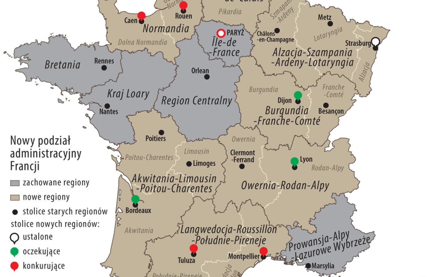 Gdy rok temu prezydent François Hollande zapowiedział skomasowanie regionów, fuzję gmin i w przyszłości zniesienie departamentów, na lokalnych baronów wszystkich partii padł blady strach. Na pierwszy ogień poszły regiony: z 22 powstaje 13. Kto straci posadę w kraju, gdzie bezrobocie to ciągle zmora? Komu przypadnie stolica w regionach połączonych? Na południu – Tuluza czy Montpellier? W nowej Normandii – Caen czy Rouen? Rouen może wygrać i to nie z powodów historycznych – tam na stosie w rynku spalono Joannę d’Arc, patronkę Francji – ale dlatego, że jest twierdzą wpływowego socjalisty, ministra Laurenta Fabiusa.