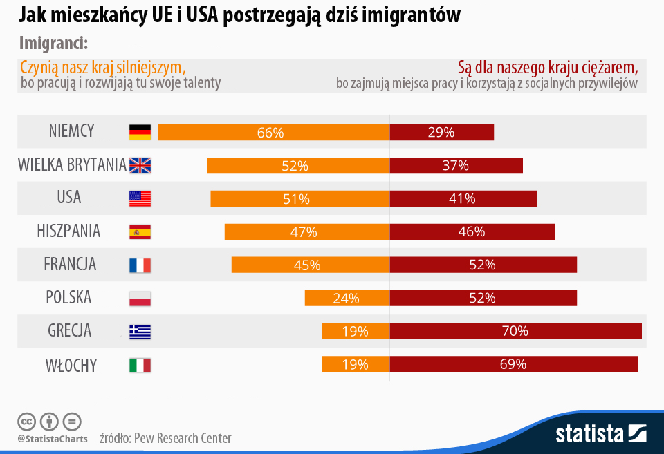 Jaki – zwłaszcza w kontekście kryzysu uchodźczego – jest stosunek do imigrantów w różnych krajach świata? To ogólne nastawienie do przybyszów sprawdzono właśnie w prestiżowym ośrodku badawczym Pew Research Center. Badani mieli określić, czy imigranci czynią ich kraj silniejszym, bo pracują tu i rozwijają swoje talenty, czy też są obciążeniem, bo odbierają rodzimym mieszkańcom miejsca pracy i rozmaite społeczne przywileje.