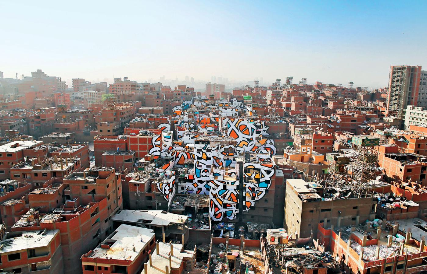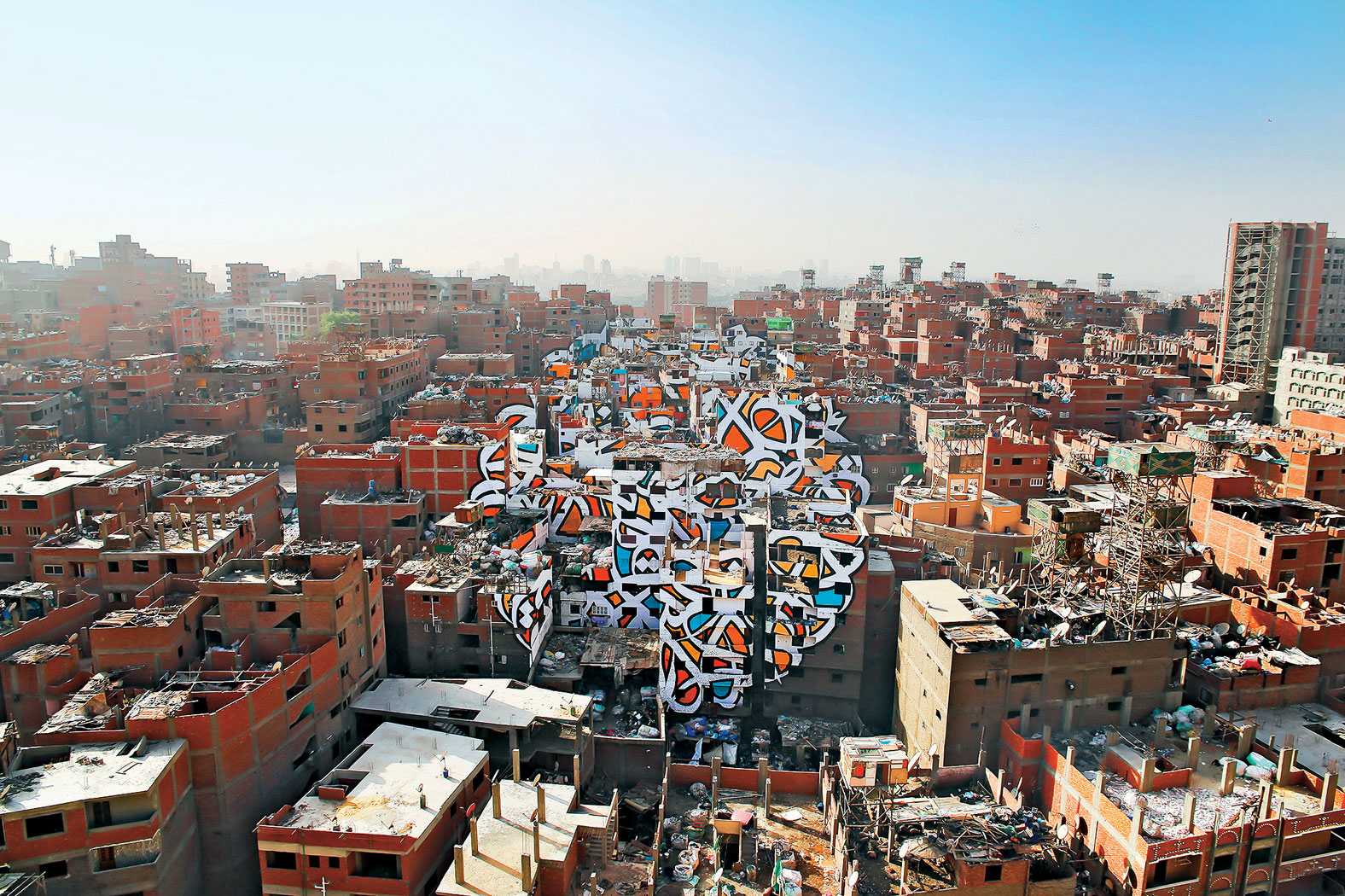Jeśli ktoś chce ujrzeć światło słońca, musi przetrzeć oczy – słowa koptyjskiego biskupa żyjącego w III w. pojawiły się w postaci gigantycznego muralu, rozłożonego na blisko 50 ścianach w zaniedbanej dzielnicy kairskich Koptów, którzy w Egipcie są obywatelami drugiej kategorii, a wielu z nich zajmuje się zbieraniem śmieci. Mural został tak zaprojektowany, że w pełni czytelny jest jedynie z odpowiedniej perspektywy i pod odpowiednim kątem – tu trzeba po prostu wspiąć się na miejscowe wzgórze Mokkattam. Pracę zaprojektował francusko-tunezyjski artysta El Seed, a stworzył ją przy udziale przyjaciół i z własnych funduszy. Aż trudno uwierzyć, że miejscowe władze przeoczyły tak wielki mural, malowany przez kilka tygodni, bo wcześniej dość sumiennie i skutecznie zwalczały lokalną scenę street artu. Praca El Seeda to niejedyny mural na świecie, który nie jest widoczny na pierwszy rzut oka. W zeszłym roku w ramach Nuart Festival w Norwegii duet Ella&Pitr stworzył mural liczący aż 21 tys. m kw. Ponieważ został namalowany na dachu wieżowca, można go podziwiać tylko z lotu ptaka.