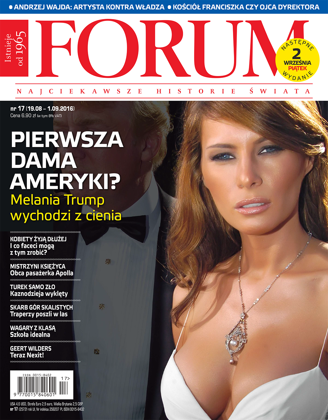 Tu wtrącę z satysfakcją, że obszerny portret Manaforta – szarej eminencji amerykańskiej polityki – przedstawiliśmy Państwu na łamach FORUM już kilka numerów temu. To w końcu nasza dewiza – pisać o ludziach i zjawiskach, zanim stanie się to modne... Tym razem proponujemy Czytelnikom sylwetkę Melanii Trump – żony kontrowersyjnego kandydata. Czy niegdysiejsza bohaterka rozbieranych sesji ma szansę zostać Pierwszą Damą?