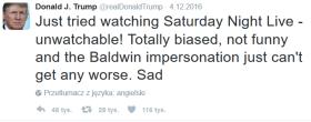Pikanterii całej sytuacji dodaje fakt, że Donald Trump nie jest zachwycony występami Baldwina. W sprawie programu publicznie zabrał już nie raz głos, pisząc na Twitterze, że „SNL” nie jest śmieszne, a Baldwin generalnie jest „do bani”.