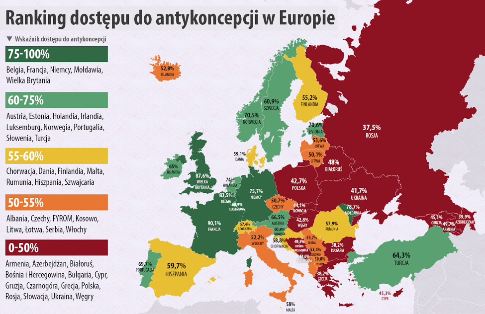 1. Mamy w Polsce jeden z niższych wskaźników dostępu do antykoncepcji wśród 45 krajów Europy – nieco ponad 42 proc. Wyprzedzają nas m.in. Rumunia, Albania, Białoruś, Mołdawia, Gruzja, Armenia, Turcja. Mamy także, czego na mapie nie uwzględniono, jeden z najniższych wskaźników przyrostu naturalnego w Europie.
