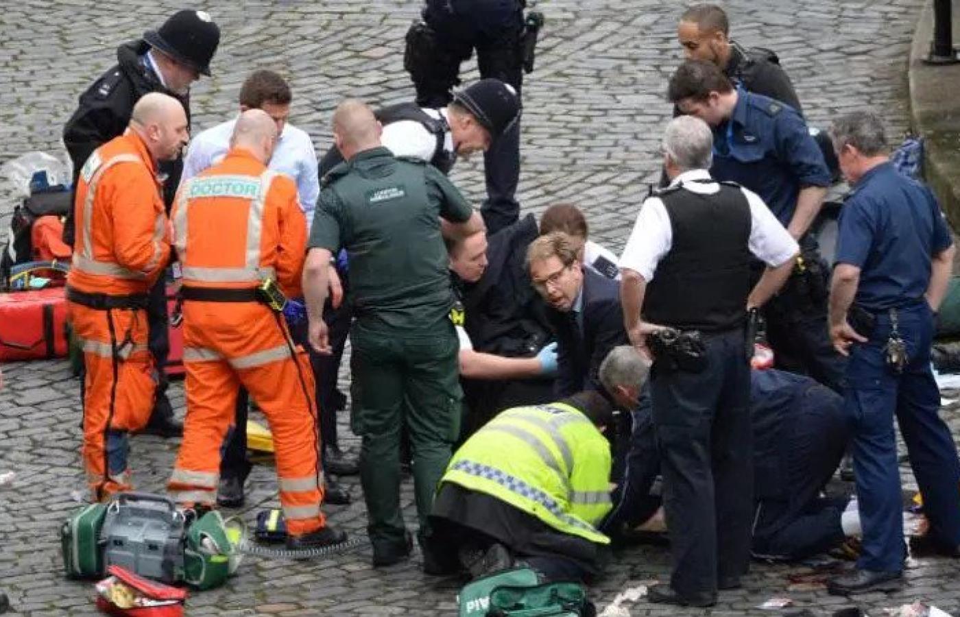 Na zdjęciu widać, jak Tobias Ellwood, wiceminister spraw zagranicznych Wielkiej Brytanii, klęczy przy rannym policjancie i próbuje go reanimować. Funkcjonariusz został ugodzony przez napastnika nożem, minister, który był na miejscu zdarzenia, próbował zatamować krew z jego ran, a także wykonywał procedurę usta-usta.