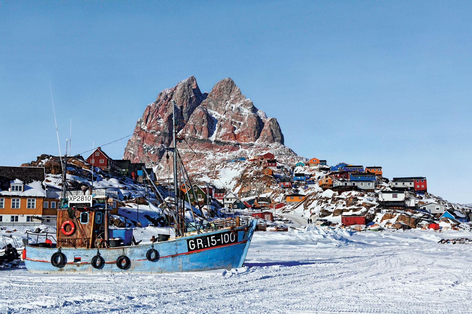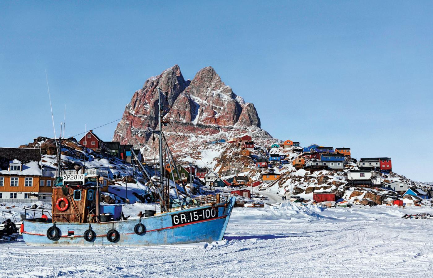Osada. Uummannaq to osada na wyspie o powierzchni 12 km kw., 460 km na północ od kręgu polarnego, zamieszkana przez ok. 1300 osób. Przez większość roku ląd nie ma tu znaczenia, bo morze skuwa lód, więc między osadami mieszkańcy przemieszczają się samochodami, skuterami śnieżnymi i psimi zaprzęgami. Na wyspę można się dostać kilka razy w tygodniu helikopterem, a jeśli ten nie przyleci, bierze się jedną z ośmiu taksówek i jedzie po lodzie.