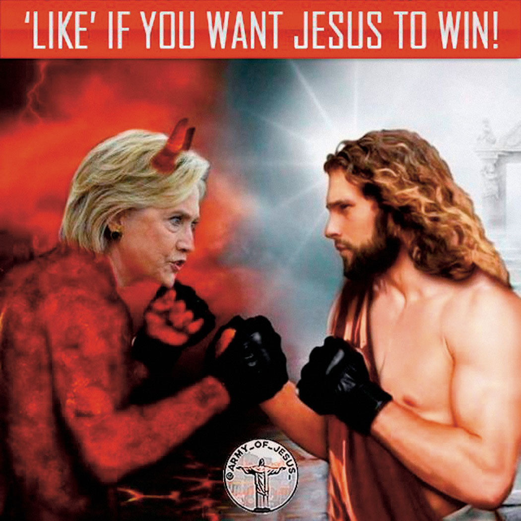 Chaos siała Armia Jezusa, kolejny produkt Rosyjskiej Agencji Badań Internetu. Na jej stronie Chrystus apelował: Stańmy zjednoczeni w armii Jezusa (217 tys. obserwujących). Zaraz potem opublikowano mem, przedstawiający walkę na pięści między Jezusem a Hillary z diabelskimi rogami na głowie. Kolejny przedstawiał uroczą dziewczynkę trzymającą w rękach obrazek Jezusa na krzyżu, a pod nim slogan: Brońmy wiary chrześcijańskiej: stop ateistycznej propagandzie! I tak postkomunistyczna Rosja mogła pomóc wygrać kandydatowi amerykańskich chrześcijańskich fundamentalistów.