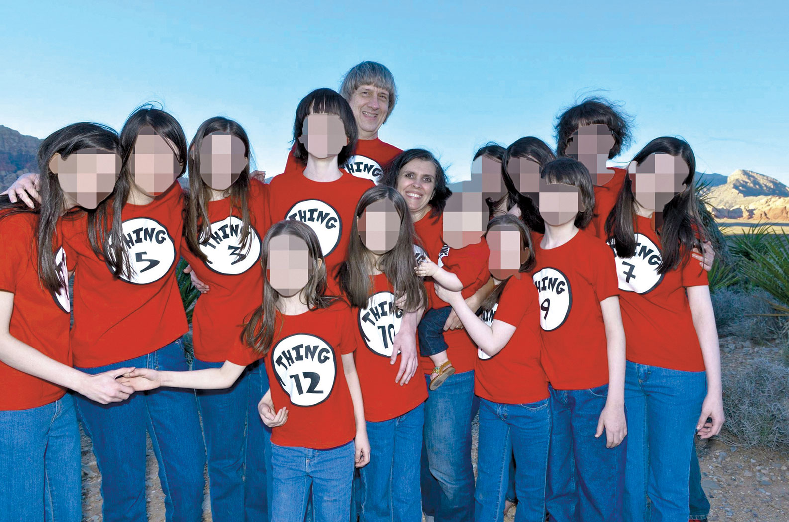 Kiedy w połowie stycznia policja weszła do domu, zastała niektóre dzieci przykute do łóżek. Były odcięte od radia, telewizji, komputerów, komórek. Dla „bezpieczeństwa” rodzice narzucili im nocny tryb życia. Na upublicznionych zdjęciach wyglądają jak normalna rodzina. Wycieczka do Disneylandu, odnowienie przysięgi małżeńskiej. Ale gdy przyjrzeć się uważniej, coś nie gra. Na jednej z fotografii dziewczynki i chłopcy wyglądają jak klony. Na innej są ponumerowane jak rzeczy. Na identycznych ubraniach mają naszywki: „Thing 1”, „Thing 2”, „Thing 3”.