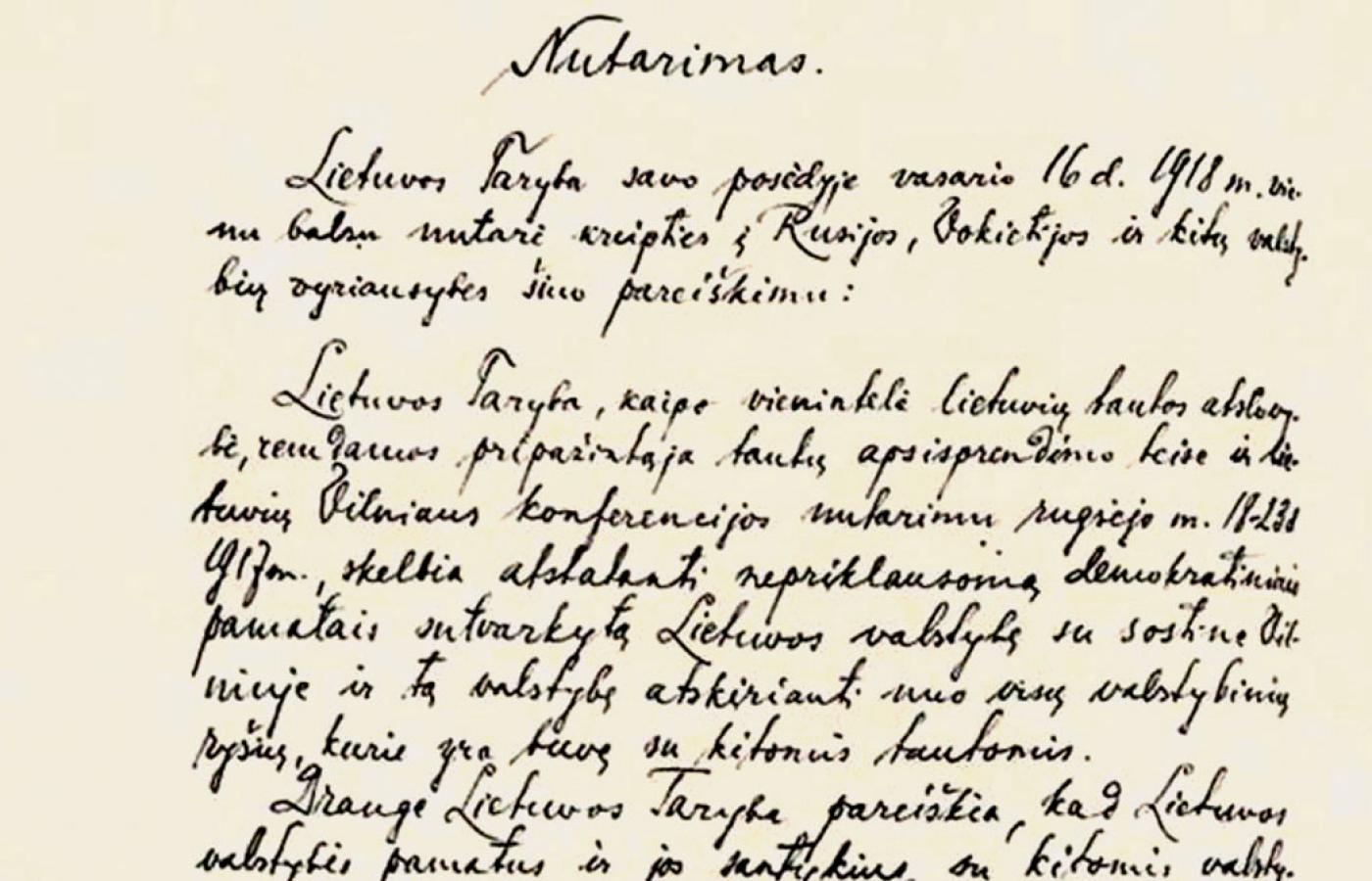 Długo nie było wiadomo, czy ocalał oryginał tekstu uchwały i podpisany przez wszystkich autorów duplikat. Pierwszy dokument w uznaniu zasług dostał na pamiątkę Jonas Basanavičˇius (szef rady znad kawiarni). Z kolei duplikat powędrował do prezydenckiego archiwum w Kownie, skąd prawdopodobnie w 1940 r. wywiózł go długoletni prezydent Antonas Smetona. Im bliżej było obchodów stulecia, tym intensywniej wzywano do poszukiwań obu wersji aktu, a nuż zawieruszyły się u kogoś na dnie szuflady albo w rodzinnych papierach. Pewien przedsiębiorca zaoferował za oryginał milion euro. Duplikat czeka na odnalezienie, za to wiosną zeszłego roku oryginał odszukał w archiwum MSZ w Berlinie prof. Liudas Mažylis. Dokument był złożony, co wskazuje, że wędrował m.