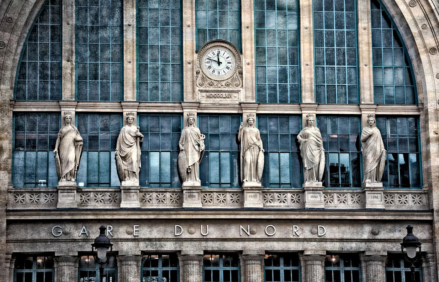 W godzinach szczytu: koszmar. Pociągi dalekobieżne, w tym TGV – na poziomie ulicy. Poziom niżej stacja metra. Jeszcze niżej kolej podmiejska. Wszystko wtłoczone w tkankę XIX-wiecznej zabudowy: imponującą kamienną fasadę z 1864 r. w formie łuku triumfalnego zwieńczają alegoryczne figury miast, do których z Gare du Nord można było podróżować. W tym ogromna figura Warszawy – rzymska bogini, która trzyma tarczę herbową z syrenką.