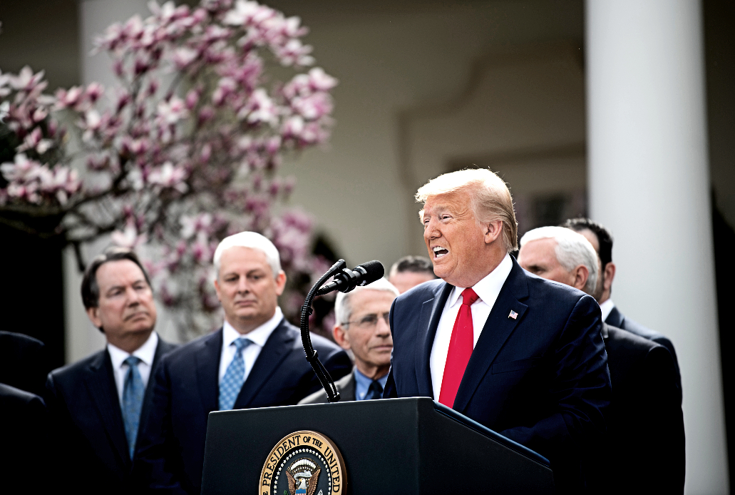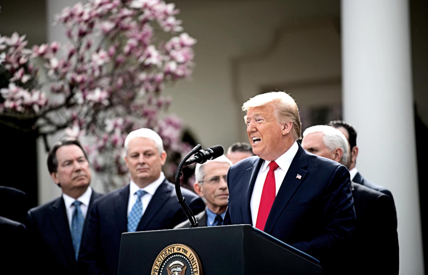 Przemawiając w otoczeniu notabli odpowiedzialnych za służbę zdrowia i działania związane z epidemią, takich jak szef NIH (National Institutes of Health) Anthony Faucci, Trump poinformował o konkretnych krokach podejmowanych przez rząd federalny, skupiając się szczególnie na testach. Przeprowadzono ich dotychczas w kraju mniej w relacji do liczby mieszkańców niż w wielu innych krajach wysoko rozwiniętych, za co opozycja i media krytykują administrację.