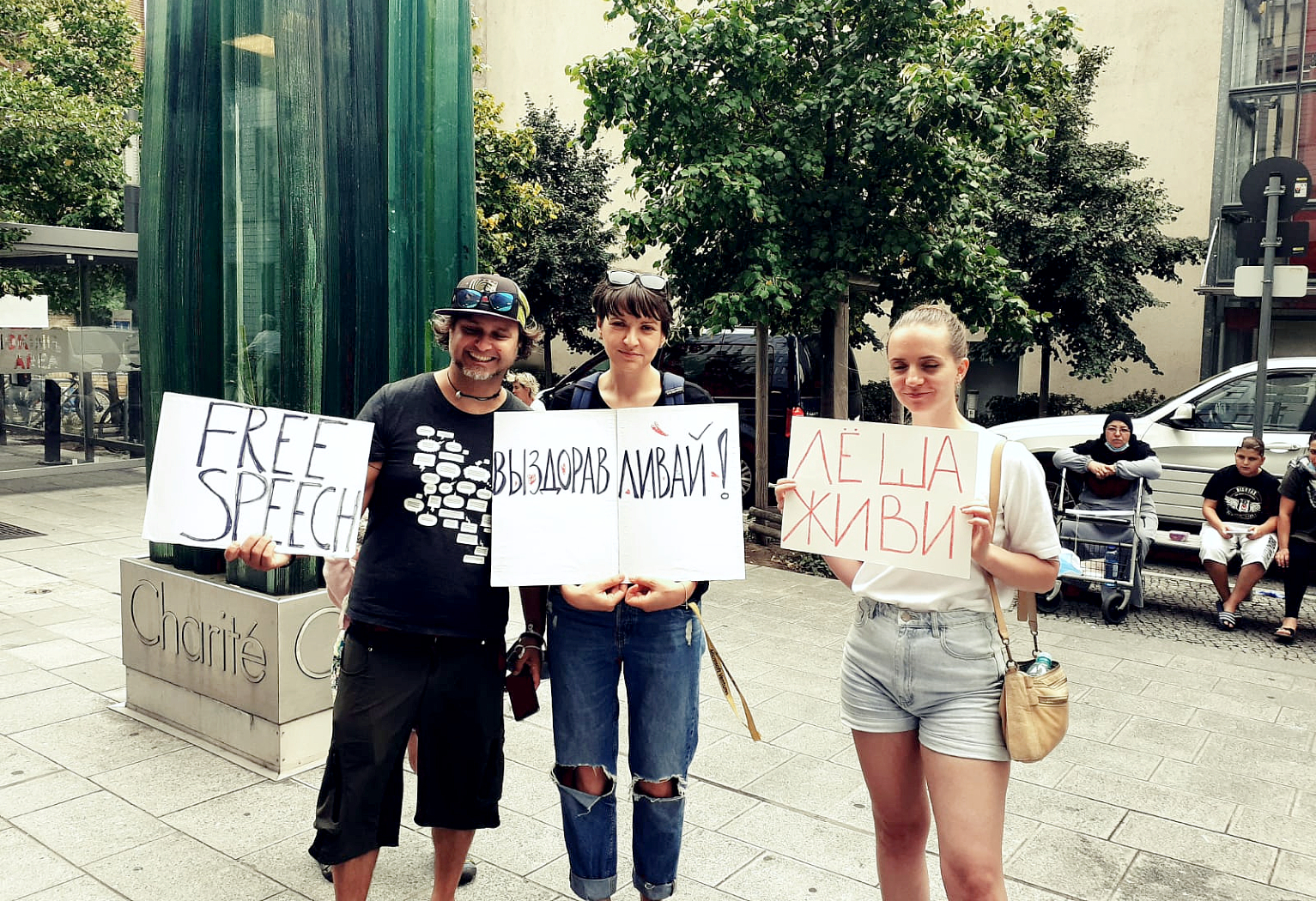 Pod szpitalem w Berlinie zebrało się trochę protestujących. Daria mieszka tu od 16 lat, na Charite towarzyszą jej kilkuletnia córka i narzeczony Niemiec. Tu spotkali Lanę, która podobnie jak oni chciała wesprzeć Nawalnego.