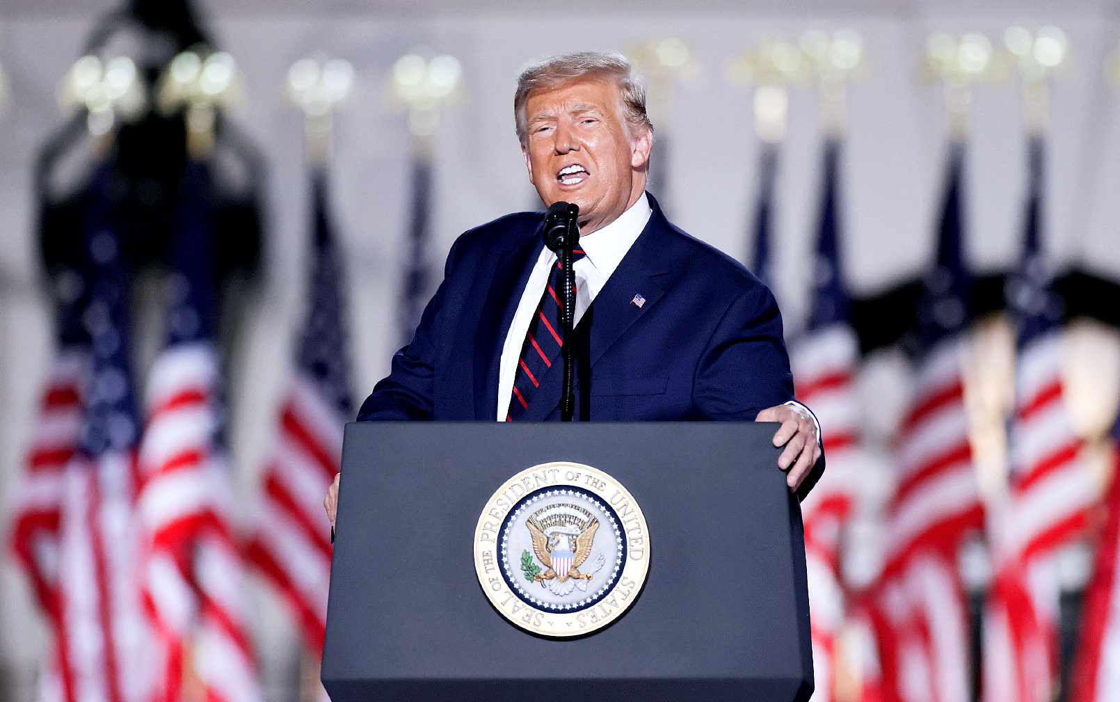 Trump przemawiał w ogrodzie Białego Domu w obecności ponad 1,5 tys. zaproszonych gości: wybranych delegatów i prominentnych polityków GOP (konwencja z powodu koronawirusa nie odbyła się w jednym miejscu). Nie zachowywali oni dystansu ani nie nosili maseczek. Prezydent utrzymywał, że znakomicie radzi sobie z pandemią i wkrótce będzie już szczepionka. Wcześniej inni mówcy, jak jego główny doradca ekonomiczny Larry Kudlow, opowiadali o zarazie w czasie przeszłym, chociaż zachorowań wciąż przybywa.