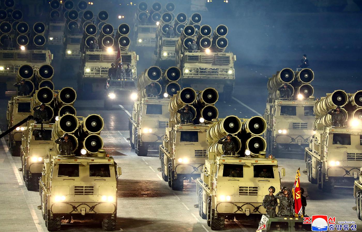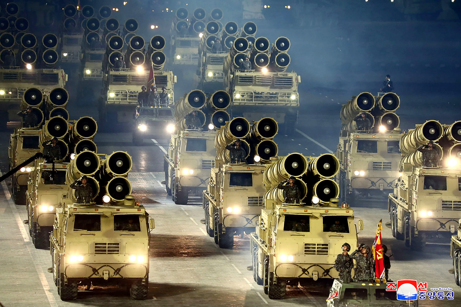 Jedenastoosiowe podwozie monstrum, a na nim pocisk – według wzrokowej oceny długości przynajmniej 25 m i średnicy 2,5 m. Zdaniem ekspertów analizujących obrazy z telewizji to Hwasong-16, najnowsze dzieło północnokoreańskich inżynierów, pocisk o niemal globalnym zasięgu. Na oko ważący ponad 100 ton, prawdopodobnie potrzebujący płynnego paliwa, a więc mimo podwozia mobilny tylko z nazwy (tankowanie takiego kolosa zabiera czas i jest łatwe do wykrycia z kosmosu), wożony raczej wyłącznie na pokaz, bo gdzie czymś takim wjechać w górzystym kraju? Eksperci spekulują, czy olbrzymia pokrywa głowicy nie kryje tak naprawdę wielu tzw. MIRV-ów, czyli indywidualnie naprowadzanych ładunków zwiększających liczbę celów dla jednego pocisku lub mylących systemy antyrakietowe.
