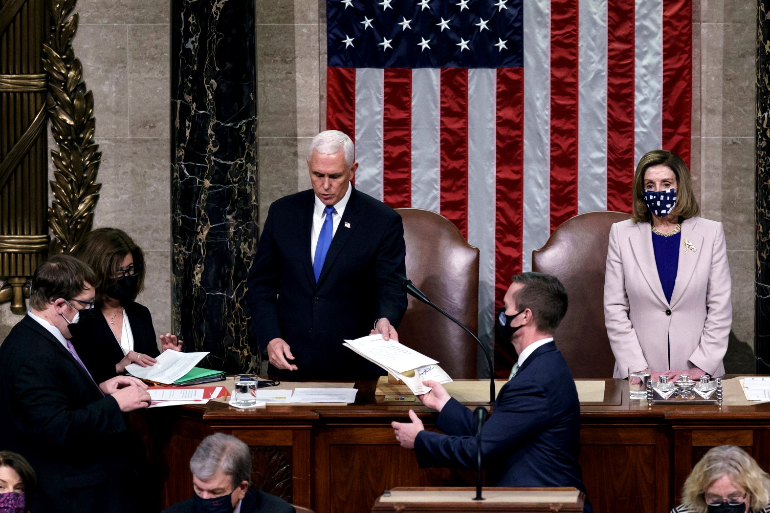 Historycznemu posiedzeniu przewodniczył wiceprezydent USA Mike Pence, który ostatecznie ogłosił Bidena wygranym. Konserwatywny polityk z Indiany nie wyszedł poza swoją przewidzianą przez prawo ceremonialną rolę i wbrew naciskom Trumpa nie odrzucił jednostronnie pakietów wyborczych, za co spotkała go krytyka ze strony gospodarza Białego Domu.