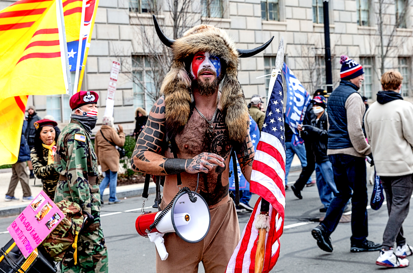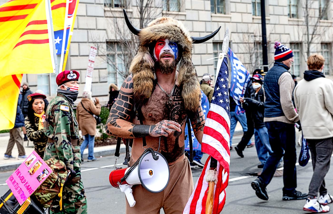 Na drugim obrazku widzimy rozbawionego faceta próbującego wynieść mównicę z Kapitolu. Wrota świątyni demokracji właśnie zostały sforsowane. Człowiek-Bizon pohukuje i szuka wiceprezydenta; chce go wyzwać na pojedynek.