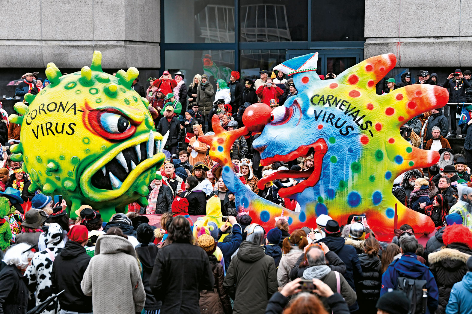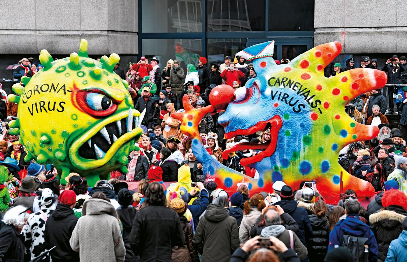Rok temu, podczas karnawałowego pochodu w Düsseldorfie, na jednej z dowcipnych, paradnych platform piękny „wirus karnawału” pożerał ze smakiem mniej urodziwego wirusa Covid-19. Minął rok i role się odwróciły: Covid okazał się niestrawny i teraz bez żenady konsumuje karnawał.