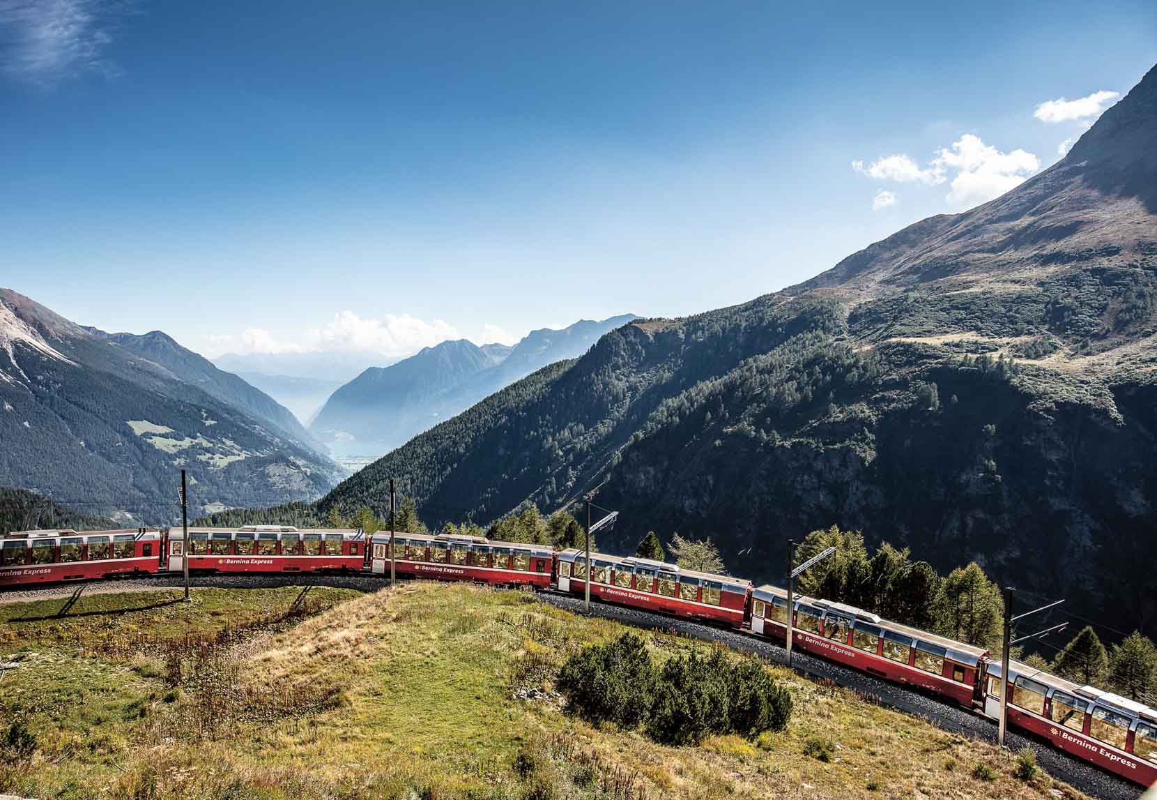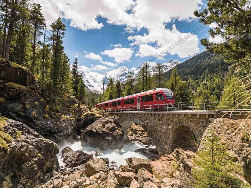 Podróż Ekspresem Bernina to wyjątkowe przeżycie z wielu powodów. Pozwala nie tylko podziwiać bardzo odmienne krajobrazy i przejeżdżać przez odmienne strefy klimatyczne od lodowców aż po palmy. Ten pociąg turystyczny Kolei Retyckich łączy trzy strefy językowe w kantonie Gryzonia i dociera aż do Włoch. Na jego trasie znajduje się 55 tuneli, 196 mostów, a nachylenie niektórych odcinków sięga nawet 70 promili. Jednak pociąg nie ma problemu z pokonaniem takiej różnicy poziomów, mimo że nie używa kół zębatych. Ekspres Bernina pozwala podziwiać surowe, lecz urzekające krajobrazy, a równocześnie oferuje odrobinę włoskiego „dolce vita”. Tak różnorodna podróż nie zdarza się często.