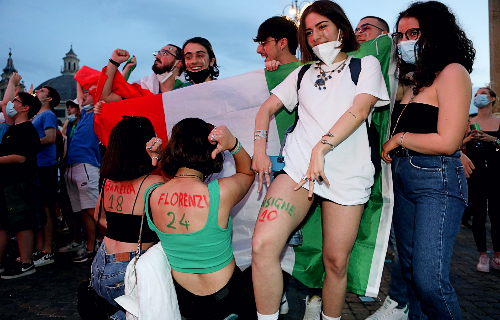 Strefa kibiców na Piazza del Popolo też nie mogła być w czasie meczu wypełniona po brzegi. Wygrała więc zasada, że kto pierwszy, ten lepszy. Każdy wpuszczany miał mierzoną temperaturę i musiał wypełnić kartę lokalizacyjną. A każdy niewpuszczony mógł tylko błagalnym wzrokiem patrzeć w uśmiechnięte, ale bezwzględne w pilnowaniu reguł twarze policjantów.
