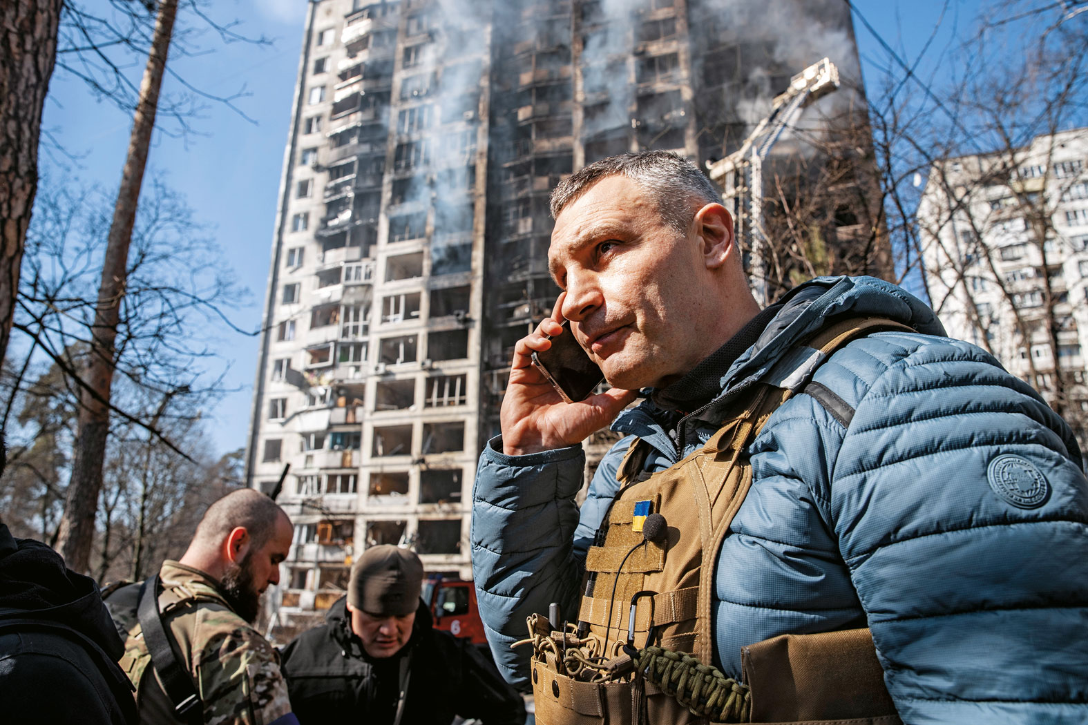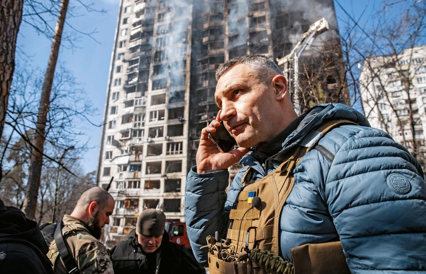 W samym Kijowie Zełenski dzieli się popularnością z innym politykiem, z którego przed wojną również się podśmiechiwano: Witalijem Kliczką, merem stolicy i byłym mistrzem boksu. Ogromnemu Kliczce (201 cm) przyjęcie bojowego image’u heroja przyszło łatwo. Wystarczyło, że założył mundur i stanął do zdjęć za karabinem maszynowym. Widać go w mieście: czasem z bratem Wołodymyrem, również bokserem, rozmawia z dziennikarzami, wzywa mężczyzn, którzy od początku wojny opuścili miasto, do powrotu, do walki.