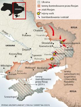 W ostatnich dniach Rosjanie rozpoczęli ofensywę w Donbasie. Jednostki pancerne i zmechanizowane spod Iziumu przeszły na drugą stronę rzeki Doniec i przełamały ukraińską obronę w pierwszej linii. Podobnie pod Siewierodonieckiem, ale tam obrońcom sprzyja jeszcze ufortyfikowany teren. Rosja rzuciła na wschodni front to, co miała najlepszego i najcięższego, m.in. pułki z kantemirowskiej dywizji pancernej. Świeże i większe siły szykuje przy granicy w Biełgorodzie i Wałujkach. Ukraina ma w Donbasie ok. 10 brygad, na pomoc idą kolejne.