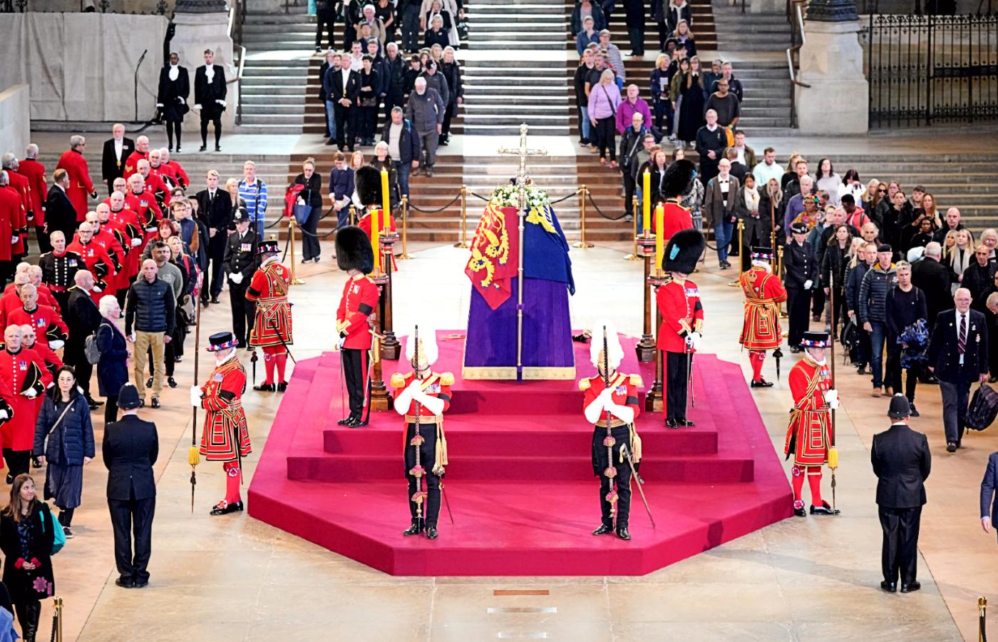Trumnę z pałacu Buckingham przetransportowano do Westminsteru. Królową żegnają poddani, od wielu dni ustawiający się w kolejce. Nikt nie ma pierwszeństwa, ani celebryci, ani politycy. Dlatego sama organizacja kolejki była wyzwaniem logistycznym. Znajdujące się na jej trasie puby oferują specjalne posiłki dla czekających, rozdawana jest woda, pracują ratownicy, wolontariusze. Ostatni hołd składają Elżbiecie II znane osoby; BBC wyemitowało np. rozmowę z Davidem Beckhamem, CNN – z arcybiskupem Westminsteru.