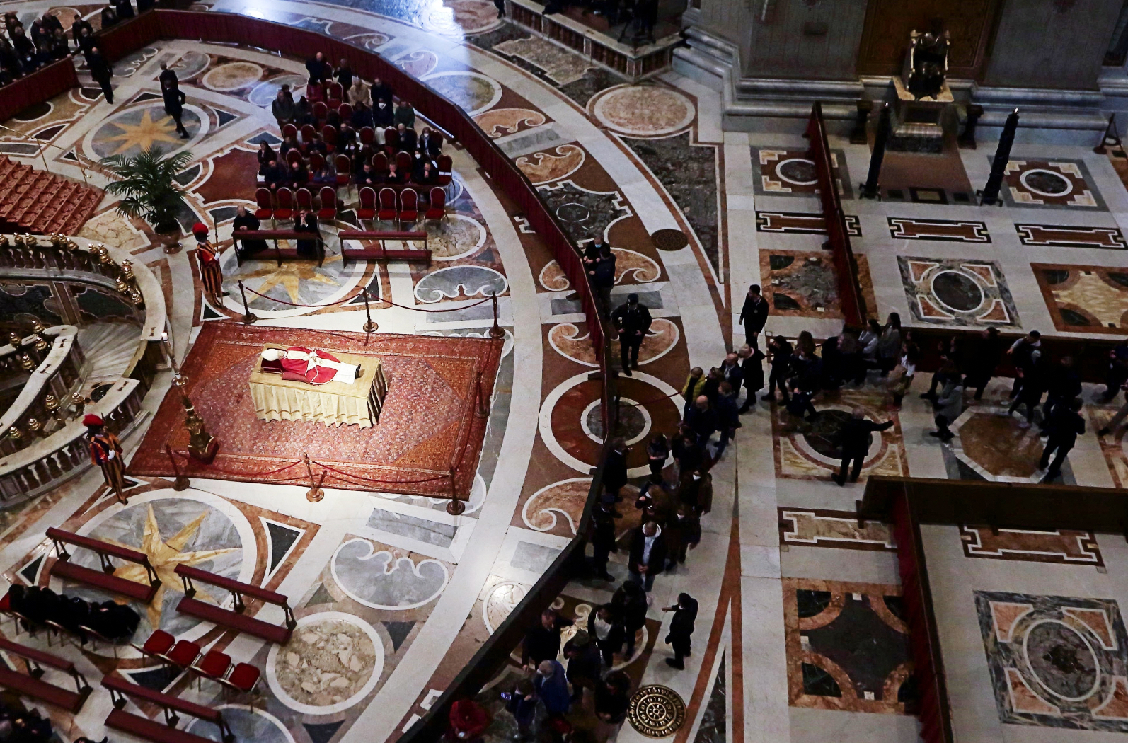 Skrupulatna kontrola bezpieczeństwa ustawiających się w kolejce do bazyliki osób przeprowadzana jest dwukrotnie, raz przez funkcjonariuszy policji, a drugi raz, jak na lotnisku, z użyciem specjalnej aparatury. Wszystko idzie sprawnie i sznur odwiedzających podąża żwawym krokiem przez całą świątynię aż do ołtarza Konfesji, przed którym na katafalku umieszczono zabalsamowane ciało Benedykta w purpurowym ornacie, białej mitrze na głowie i czarnych półbutach (a nie czerwonych, które zwykle nosił jako papież).