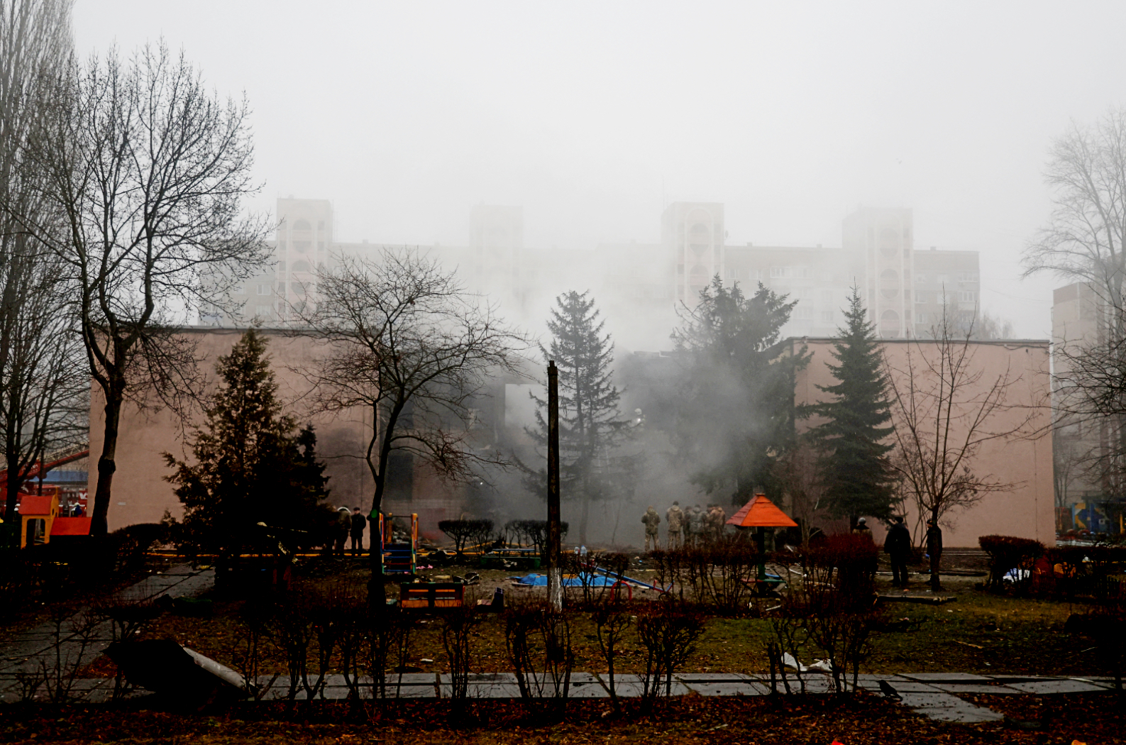 Helikopter rozbił się bardzo blisko przedszkola, wybuchł pożar, natychmiast rozpoczęto akcję ratowniczą. Kyryło Tymoszenko, zastępca szefa biura prezydenta Ukrainy, podał na Telegramie, że „maszyna uderzyła w obiekt infrastruktury; badane są okoliczności wypadku (…) na miejscu obecne są wszystkie służby”.