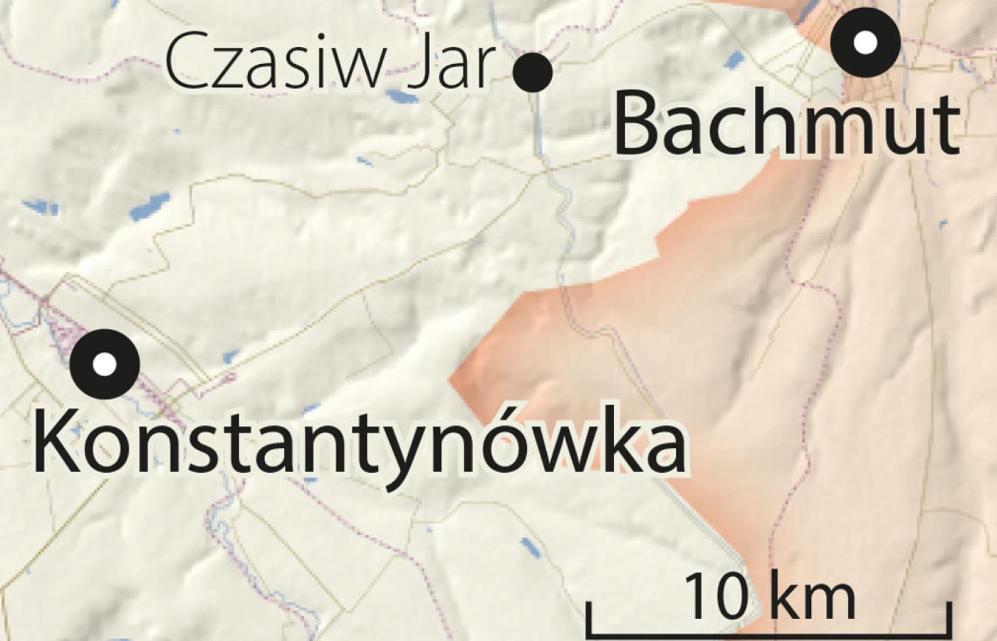 Długość frontu wynosi okrągłe 1,5 tys. km. Aż dziwne, że niewielkie miasteczko Bachmut od tygodni było punktem centralnym tej wojny. Rosjanie wściekle przypuszczali szturm za szturmem. Ukraińcy bronili się wczepieni pazurami w każdą ulicę i dom. Wypychani coraz dalej na zachód. Trwali, choć tak naprawdę mogliby odstąpić. Już dawno za ich plecami, na wzgórzach, powstała kolejna solidna linia obrony.